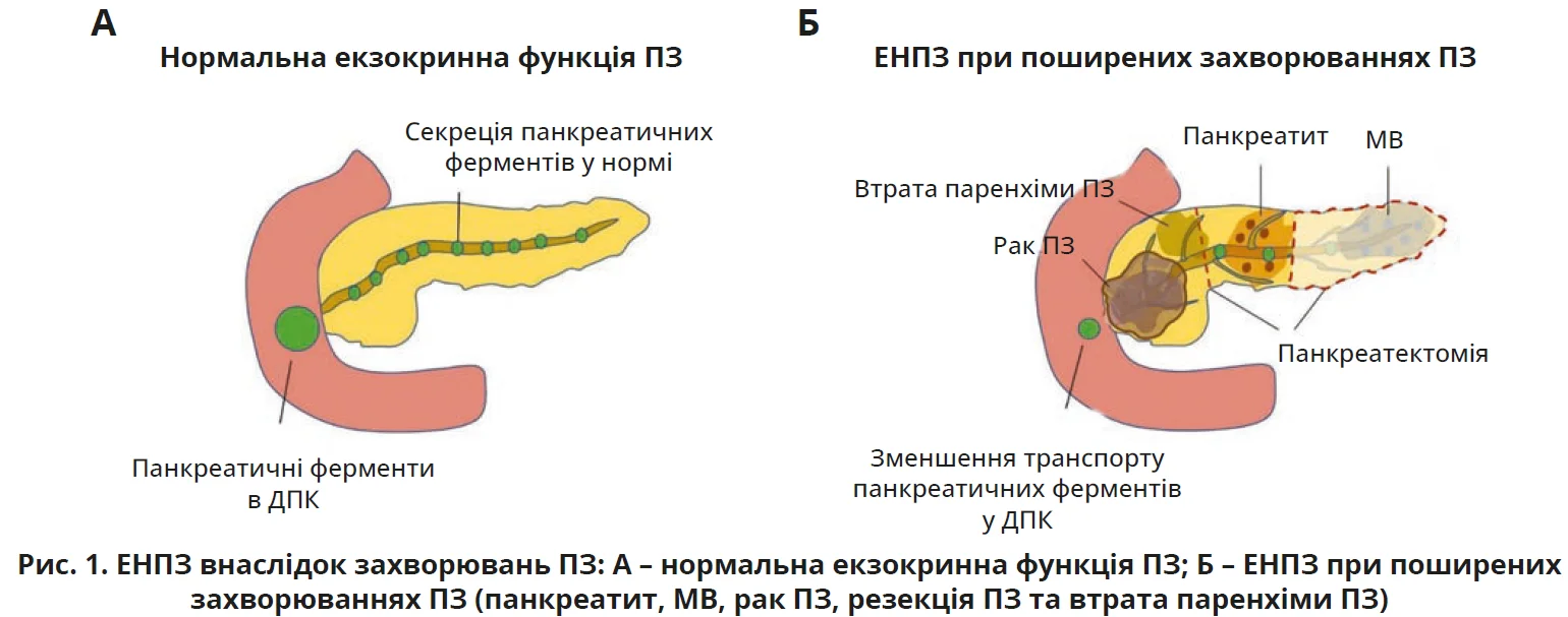 Екзокринна недостатність підшлункової залози (ЕНПЗ) – це синдром, за якого екзокринна дисфункція підшлункової залози (ПЗ) та порушення перетравлення виникають з різних причин. Мальабсорбція виникає, коли рівень травних ферментів ПЗ у дванадцятипалій кишці (ДПК) знижується на 5-10% від нормального рівня, що призводить до появи таких симптомів, як стеаторея (жирні випорожнення), втрата ваги, абдомінальний біль та інші порушення травлення [1-3]. Симптоми ЕНПЗ спостерігають у разі синдрому подразненого кишківника [4], целіакії [5], запальних захворювань кишківника (ЗЗК) [6], синдрому Золлінґера – Еллісона [7] та синдрому надлишкового бактерійного росту [8, 9]. Персистивні симптоми погіршують якість життя пацієнтів [10-12].