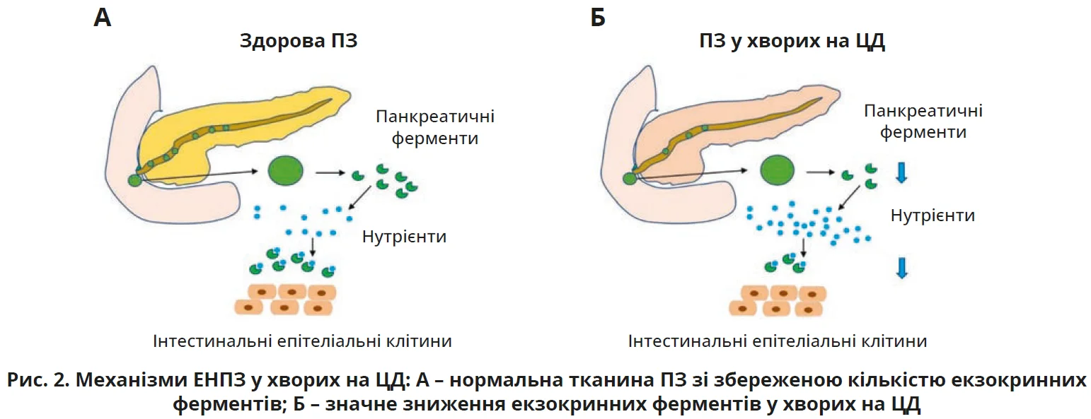 ЦД, який тісно пов’язаний з екзокринною й ендокринною системами ПЗ, є вагомим фактором ризику розвитку ЕНПЗ. Ендокринна патологія спричиняє порушення екзокринної функції ПЗ і навпаки. При використанні ФЕ-1 як діагностичного критерію ймовірність виникнення ЕНПЗ значно вища в пацієнтів із ЦД 1-го типу порівняно з пацієнтами із ЦД 2-го типу. Результати вимірювання ФЕ-1 указують, що поширеність ЕНПЗ серед пацієнтів із ЦД 1-го типу становить у середньому 40%, тоді як серед осіб із ЦД 2-го типу вона дорівнює в середньому 27% [72]. Наявність екзокринної дисфункції ПЗ пов’язана з усіма формами ЦД [73]. Потенційна етіологія ЕНПЗ при ЦД як 1-го, так і 2-го типу різноманітна й охоплює: