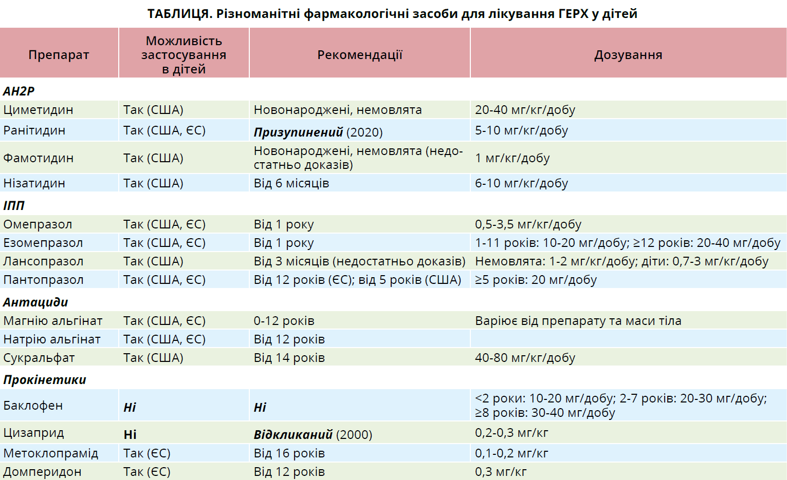 Існують різні підходи до фармакотерапії ГЕРХ у дітей (табл.). АН2Р пригнічують секрецію шлункової кислоти шляхом блокування Н2-рецепторів на парієтальних клітинах шлунка та застосовуються в дітей старшого віку й підлітків, незважаючи на те що вони менш ефективні, ніж ІПП, у нівелюванні симптомів і загоєнні езофагіту [15, 16].