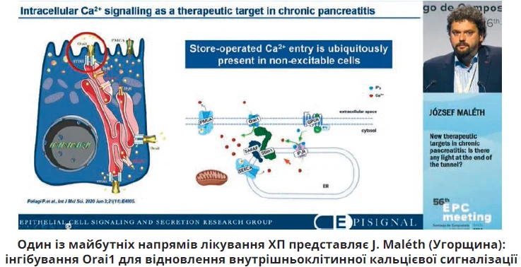 На думку доповідача, майбутні стратегії фармакотерапії ХП ґрунтуватимуться на трьох патофізіологічних напрямах, і перший із них – це відновлення нутрішньоклітинної кальцієвої сигналізації ацинарних клітин за допомогою інгібування білків Orai1, які полегшують надходження іонів у клітину. Другий напрям буде зосереджений на розробленні ліків, які впливатимуть на інгібітор активації плазміногену-1 (РАІ-1), який не тільки сприяє коагуляції, але й активує процеси деградації екстрацелюлярного матриксу та ремоделювання тканин, що спостерігається при хронічних запальних захворюваннях. Третій напрям пов’язаний із відновленням експресії CFTR-каналів, відповідальних за експресію іонів хлору, адже зменшення експресії CFTR супроводжується зниженням умісту бікарбонатів у секреті підшлункової залози (ПЗ), його згущенням, уповільненням току секрету й обструкції протоків ПЗ.
