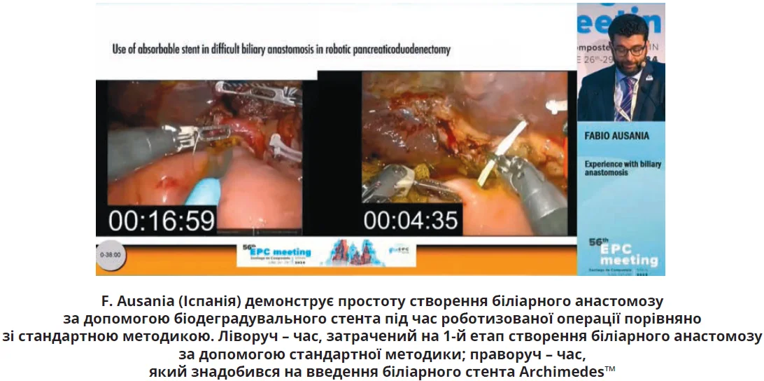 ЕРС-2024 став майданчиком для обміну досвідом не тільки між представниками терапевтичних спеціальностей, а й між гепатопанкреатобіліарними (ГПБ) хірургами, які ділилися практичним досвідом і представляли перші клінічні результати застосування різних технічних інновацій. Одна з них була презентована під час сателітного симпозіуму «Екстрені новини в ГПБ-хірургії: біодеградувальні стенти», під час якого професор Stefano Partelli (Італія) не лише навів разючі статистичні дані щодо власного досвіду створення панкреатичного анастомозу за допомогою внутрішніх біодеградувальних панкреатобіліарних стентів Archimedes™, але й продемонстрував яскраві інтраопераційні відеозаписи їх установлення. Відмінними особливостями стентів Archimedes™, які схвалені Управлінням США з контролю продовольства та медикаментів (FDA), є здатність самостійно розпадатися шляхом гідролізу протягом 12 діб – 11 тижнів залежно від типу застосованого пластиру, спіралеподібний дизайн, який покращує відтік жовчі та полегшує імплантацію, наявність спеціальних ділянок для фіксації, що дає змогу мінімізувати ризик міграції стента.