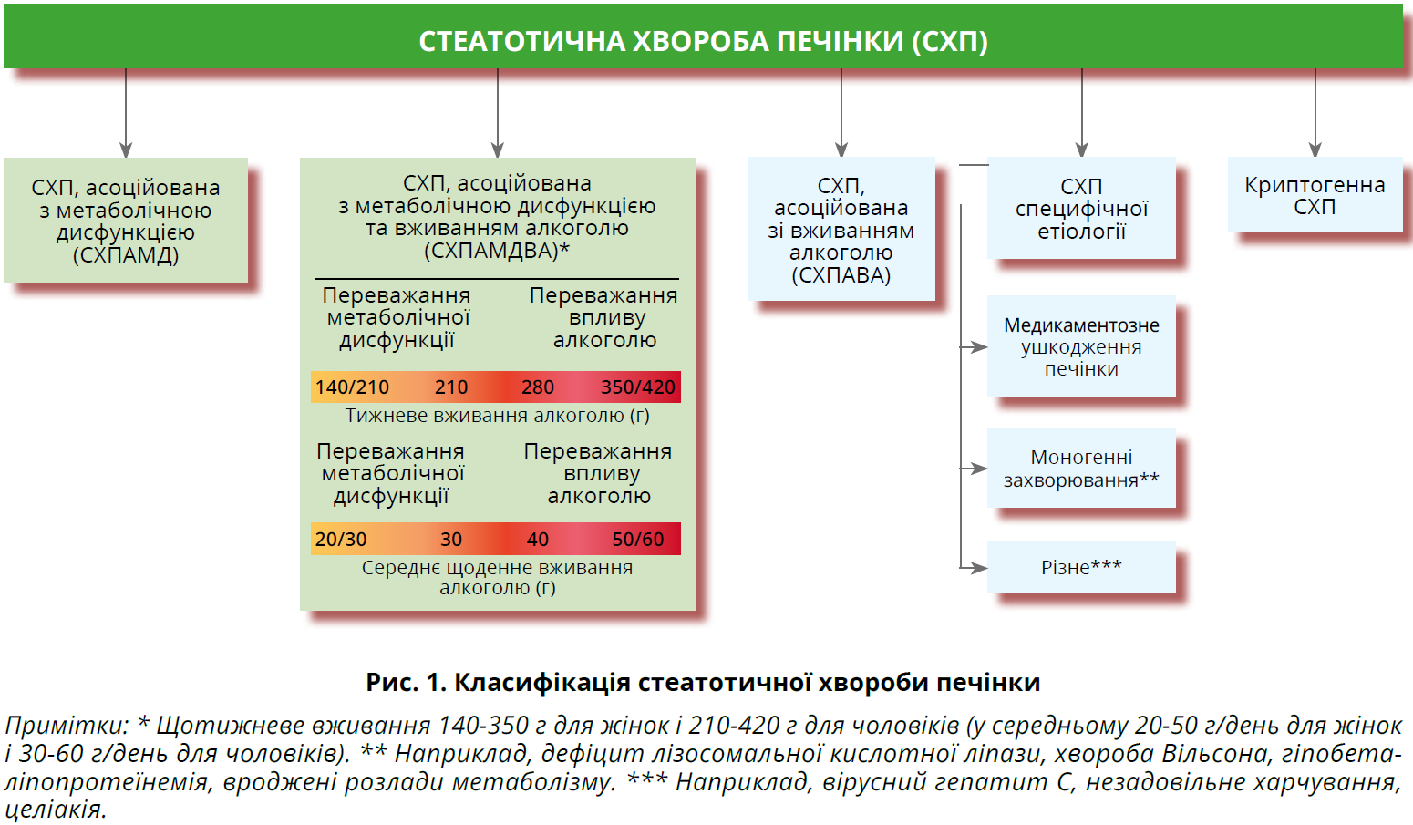 Поточне визначення НАЖХП виключає вживання алкоголю в дозах >20 і >30 г на день для жінок і чоловіків відповідно. Натомість визначення СХПАМД є більш ліберальним, але в групі осіб із СХПАМД запропоновано виділяти підгрупу із СХПАМДВА, критерієм діагностики якої є споживання 140-350 г алкоголю на тиждень для жінок і 210-420 г на тиждень для чоловіків. У осіб із СХПАМДВА домінувальним тригерним чинником стеатозу може бути або метаболічна дисфункція, або вживання алкоголю, але з часом домінувальний чинник може змінюватися.