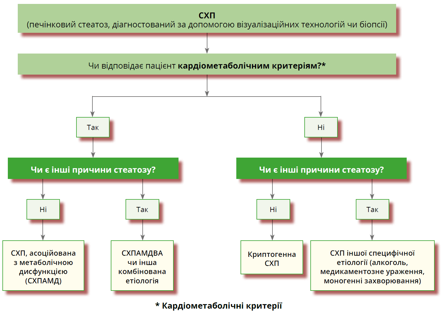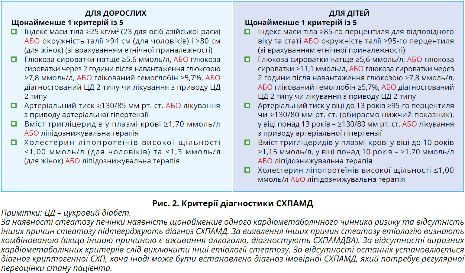 Потужний епідеміологічний зв’язок між НАЖХП, метаболічною дисфункцією й інсулінорезистентністю став причиною визнання того, що діагноз має ґрунтуватися на підтверджувальних критеріях, а не на запереченнях, як-от «неалкогольна». Автори погодили, що пацієнти зі стеатозом печінки та щонайменше одним із перелічених на рисунку 2 кардіометаболічних критеріїв вважатимуться особами із СХПАМД. Установлюючи цей діагноз, слід підтвердити/виключити інші причини стеатотичного ураження печінки, що особливо важливо в дітей, оскільки в пацієнта може відзначатися сполучення патологічних станів.