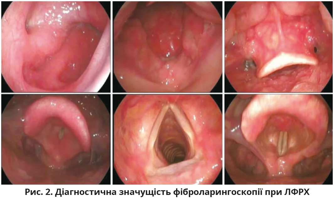 ЛФРХ є поширеним захворюванням з великою кількістю клінічних симптомів, які іноді корегуються емпірично та без підтвердження діагнозу. Існують деякі суперечності між думками фахівців різних галузей щодо діагностики ЛФРХ та її визначення. Специфічність діагностичних методів згідно з даними літератури не є ідеальною [31]. Нині найпоширенішими методами діагностики є збирання анамнезу, фізикальне обстеження, фіброларингоскопія (рис. 2), 24-годинний рН-моніторинг, 24-годинна багатоканальна інтралюмінальна імпедансометрія, стравохідна манометрія, визначення біомолекулярних маркерів, нуклідне сканування для виявлення пепсину, езофагографія, оцінювання за шкалою рефлюксу й експериментальне лікування.