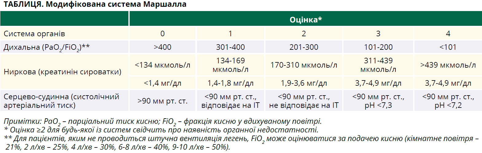 Оновлена Атлантська класифікація ГП поділяє це захворювання на два типи (інтерстиційний набряковий і некротичний) і три ступені тяжкості: незначна (без місцевих або системних ускладнень і недостатності органів); помірно тяжка (з наявністю місцевих або системних ускладнень та/або органною недостатністю, яка зникає впродовж 48 годин) і тяжка (з органною недостатністю, яка триває понад 48 годин). Інтерстиційний набряковий підтип зазвичай асоціюється з незначною тяжкістю, натомість некротичний панкреатит переважно відзначається в пацієнтів із помірно тяжким або тяжким перебігом хвороби. В аспекті органної недостатності слід оцінити стан трьох систем органів (дихальної, сечовидільної та кардіоваскулярної) за модифікованою системою Маршалла (табл.).