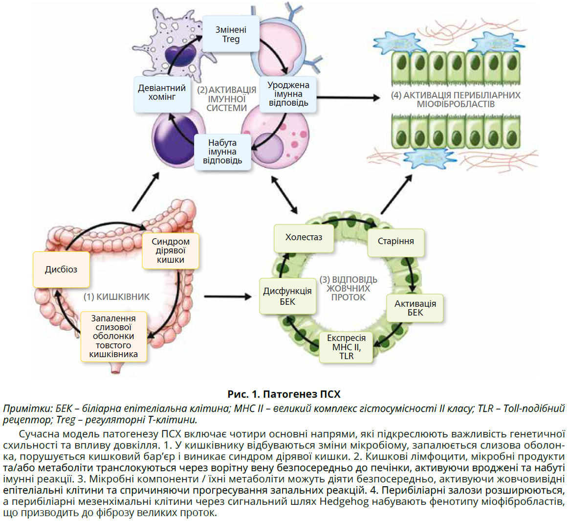 Існує чітка генетична схильність, пов’язана з носійством лейкоцитарного антигену людини (HLA) [42-48] та інших додаткових не-HLA-локусів [46, 49]. Дані доказової медицини свідчать, що ЗЗК може стати причиною ПСХ, а не просто епіфеноменом [52, 53]. Кілька досліджень продемонстрували порушення кишкового бар’єра при ПСХ [54-56]; з’являється дедалі більше доказів впливу дисбактеріозу товстого кишківника на виникнення ПСХ [57-72]. Порушення міграції лімфоцитів кишківника [73, 74] та/або транслокація мікробних компонентів або метаболітів [67, 75, 76] здатні індукувати активацію біліарних епітеліальних клітин, перибіліарне запалення з участю макрофагів [77, 78], еозинофілів [79-81] і Т-клітин [82-84]. Однак специфічний антиген / імунна відповідь іще не визначені [85-87]. Фіброз великих жовчних проток у разі ПСХ асоційований із гіперплазією перибіліарних залоз і активацією перибіліарних мезенхімальних клітин, які набувають фенотипу міофібробластів [93, 94]. Стриктури великих жовчних проток, зменшення відтоку жовчі підвищують тиск жовчі; холестаз-асоційовані зміни жовчі здатні додатково спричиняти прогресування захворювання [95-97].