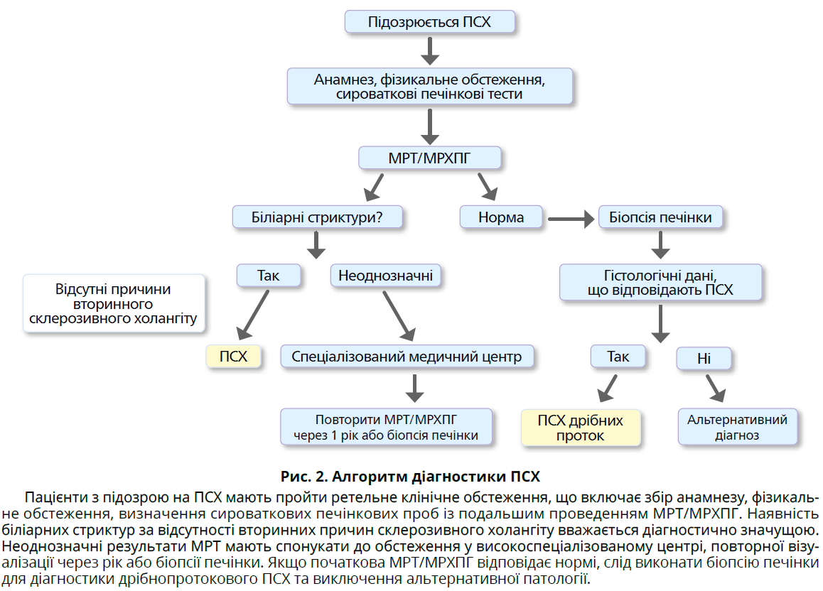 ПСХ слід підозрювати в усіх пацієнтів із холестазом, особливо на тлі ЗЗК. Діагноз ґрунтується на виявленні характерних стриктур під час холангіографії (рис. 2). Обов’язково потрібно виключати вторинний склерозивний холангіт, особливо за відсутності ЗЗК (табл. 2).