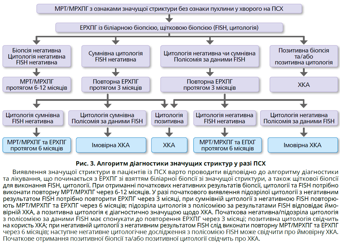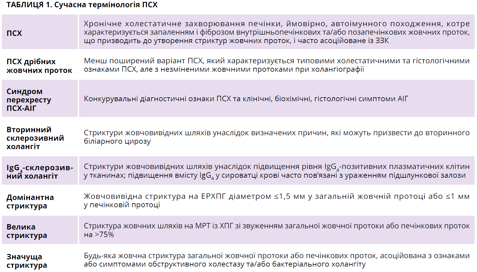 ПСХ являє собою холангіопатію, яка характеризується хронічним фіброзним запаленням, пошкодженням біліарного дерева й часто поєднується із ЗЗК. Більшість пацієнтів із ПСХ мають фіброзні жовчні стриктури на холангіограмі, тоді як невелика кількість страждає від ПСХ дрібних проток на тлі незміненої холангіограми, але з типовими гістологічними ознаками ПСХ у біоптатах печінки. У невеликій кількості випадків спостерігають overlap-синдром ПСХ – автоімунний гепатит (АІГ). ПСХ уражає як чоловіків, так і жінок і може виникати в будь-якому віці. Він вважається автоімунним захворюванням, хоча патофізіологія залишається недостатньо вивченою. ПСХ часто призводить до холестатичного ураження печінки, цирозу, печінкової недостатності та може рецидивувати у 20-30% пацієнтів після трансплантації. ПСХ супроводжується високим ризиком розвитку ХКА та колоректального раку. Наразі немає ефективного лікування ПСХ; у таблиці 1 наведено нову термінологію, яка характеризує біліарні стриктури.