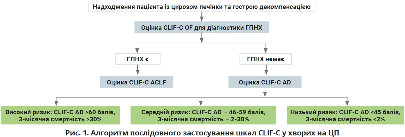 За умови підтвердження ГПНХ оцінюють стан пацієнта за шкалою CLIF-C ACLF, яка допомагає визначити ступінь тяжкості та прогноз виживаності. Якщо ГПНХ немає, то стан оцінюють за іншою шкалою – CLIF-C AD, яка відображає ризик декомпенсації (низький, середній і високий) (рис. 1). Ці моделі дають змогу кількісно оцінити ступінь органної дисфункції, визначити прогноз виживаності й оптимізувати тактику лікування у хворих з тяжкими формами ЦП.