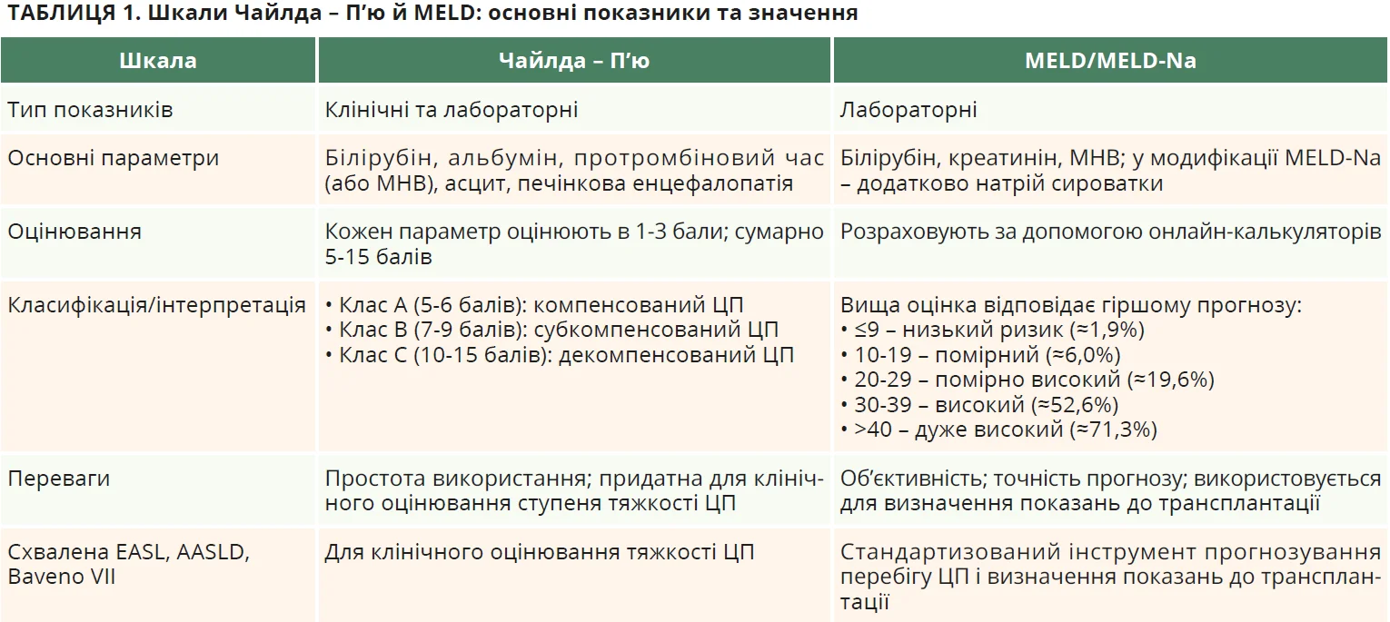 Протягом багатьох років основним інструментом для оцінювання тяжкості ЦП була шкала Чайлда – П’ю, запропонована ще в 1973 р. Вона ґрунтується на поєднанні клінічних і лабораторних показників (табл. 1). Утім, ця шкала має певну суб’єктивність, що обмежує її використання в порівнянні стану різних пацієнтів, особливо при відборі кандидатів на трансплантацію. Тому згодом було розроблено шкалу MELD, засновану виключно на лабораторних показниках: умісті креатиніну, білірубіну та міжнародному нормалізованому відношенні (МНВ). Її оновлена версія, відома під назвою MELD-Na, додатково враховує вміст натрію в сироватці крові, що дає змогу підвищити точність прогнозу (табл. 1). Перевагами цієї моделі є її об’єктивність і можливість кількісно оцінити ризик летального наслідку протягом 3 місяців. Для зручності створено численні онлайн-калькулятори MELD і MELD-Na, які дають змогу швидко розрахувати бал за введеними лабораторними показниками.