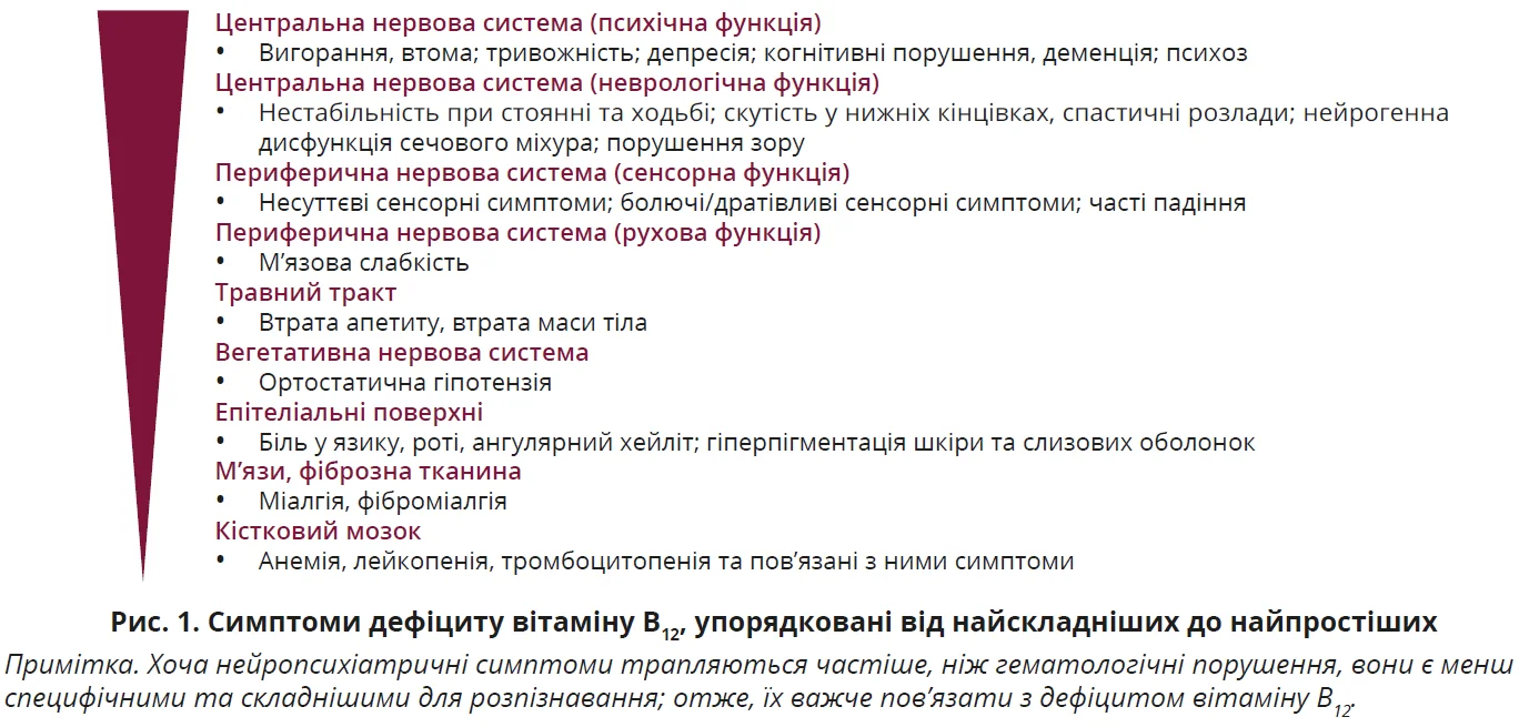 Дефіцит вітаміну B12 може проявлятися гематологічними та нейропсихіатричними станами, зокрема сенсорною нейропатією (рис. 1). Тривалість покращення симптомів після початку терапії доволі варіабельна, проте зазвичай становить від кількох тижнів до 1 року. Іноді неврологічні симптоми можуть зберігатися навіть після нормалізації показників крові.