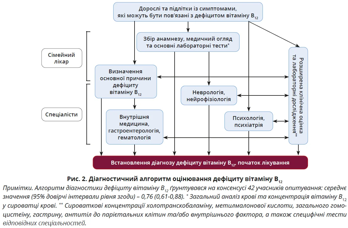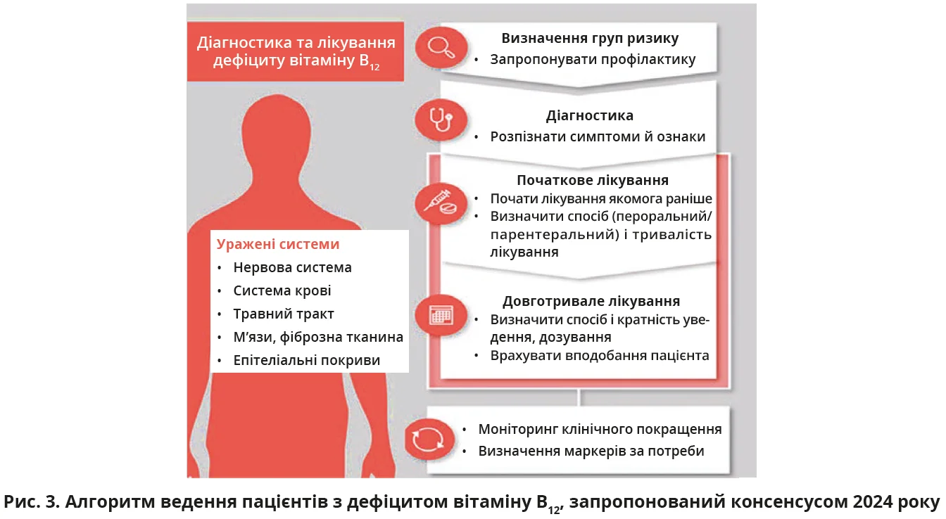 У цьому дослідженні представлено огляд узгоджених даних щодо діагностики та лікування дефіциту вітаміну B12 (рис. 3). Крім того, в межах дослідження Delphi було сформульовано надійний консенсус щодо різних аспектів діагностики й терапії дефіциту B12 з метою підтримки медичної практики в тих сферах, де наявні докази є недостатніми. Експерти погодилися щодо потреби освітніх і організаційних змін у поточній практиці. Хоча клінічним симптомам слід надавати більшої ваги в діагностиці дефіциту вітаміну B12, учасники панелі визнали необхідність використання концентрацій ціанокобаламіну в сироватці крові як економічно ефективного маркера для скринінгу, а також необхідність додаткового вимірювання метаболічних маркерів для підтвердження діагнозу. Шлях, доза та тривалість терапії вітаміном B12 залежать від гостроти й тяжкості симптомів, причини дефіциту, вподобань пацієнта та цілей лікування.