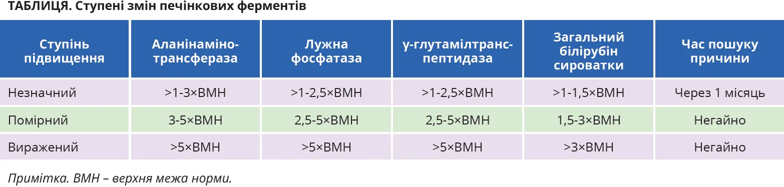 Це зумовлює потребу в моніторингу лабораторних показників функції печінки раз на 6 місяців, хоча в пацієнтів із довготривалою ремісією або осіб, які приймають лише 5-аміносаліцилати, ці обстеження можна проводити раз на 12 місяців. Подальша тактика ґрунтується на ступені підвищення печінкових ферментів. Незначне підвищення зазвичай потребує повторного аналізу через 1 місяць, а помірне або значне – негайного пошуку етіологічного чинника (табл.).