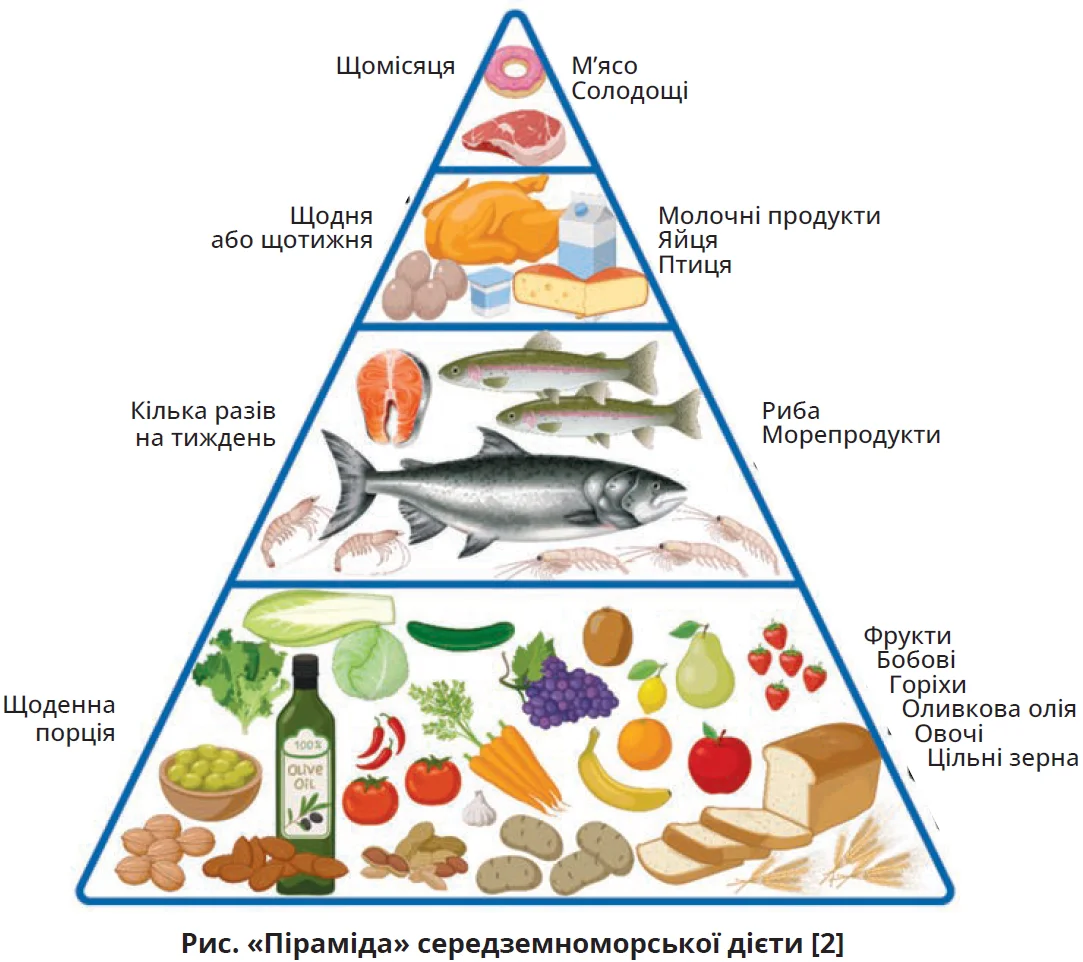 Середземноморська дієта (СМД) характеризується підвищеним споживанням цільнозернових продуктів, фруктів, овочів, бобових, горіхів, оливкової олії, помірним умістом риби/морепродуктів, молочних продуктів, вина й обмеженим споживанням м’яса (особливо червоного) (рис.) [2].