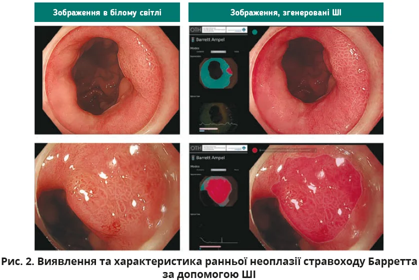 Для підвищення точності моделі навчають на даних, які містять не лише карциноми, а й некарциномні ураження (запальні зміни, ектопічну слизову оболонку), а також ранні форми раку з тонкими морфологічними ознаками, що часто залишаються непоміченими при стандартній ендоскопії. У перспективі системи ШІ можуть стати важливим інструментом для відбору уражень, придатних до ендоскопічної резекції, та для підвищення точності діагностики загалом.