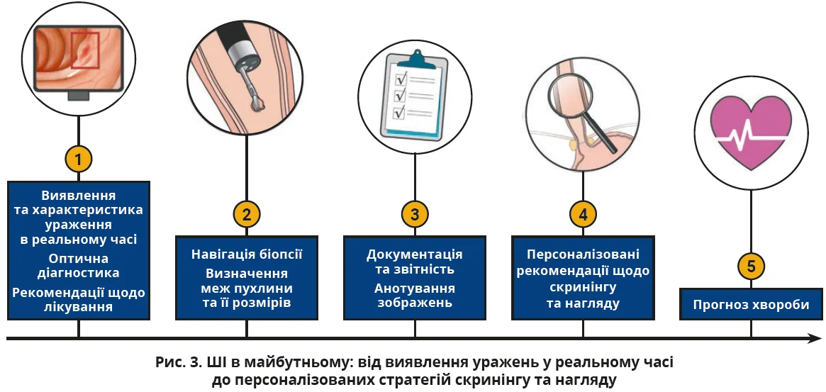 Перспективи розвитку охоплюють інтеграцію мультимодальних даних, автоматизоване керування ендоскопією в реальному часі та персоналізоване оцінювання ризику, що може істотно покращити результати лікування й економічну ефективність.