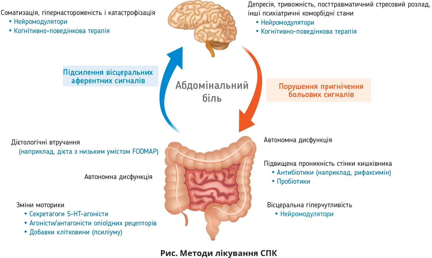 Провідним симптомом СПК є біль у животі. Схвалені FDA препарати здатні зменшувати абдомінальний біль у деяких, але не в усіх пацієнтів з СПК. Із цією метою застосовуються нейромодулятори – препарати, покликані знизити й вісцеральний біль, і центральну гіперчутливість. До нейромодуляторів належать трициклічні антидепресанти (ТЦА), інгібітори зворотного захоплення серотоніну та норадреналіну й інші препарати (габапентин, прегабалін).