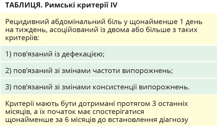Синдром подразненого кишківника (СПК) – це поширений хронічний стан, зумовлений дисфункцією осі кишківник – мозок, який значно погіршує якість життя пацієнтів. Для діагностики СПК застосовуються Римські критерії IV (табл.).
