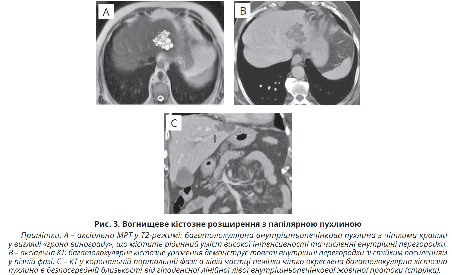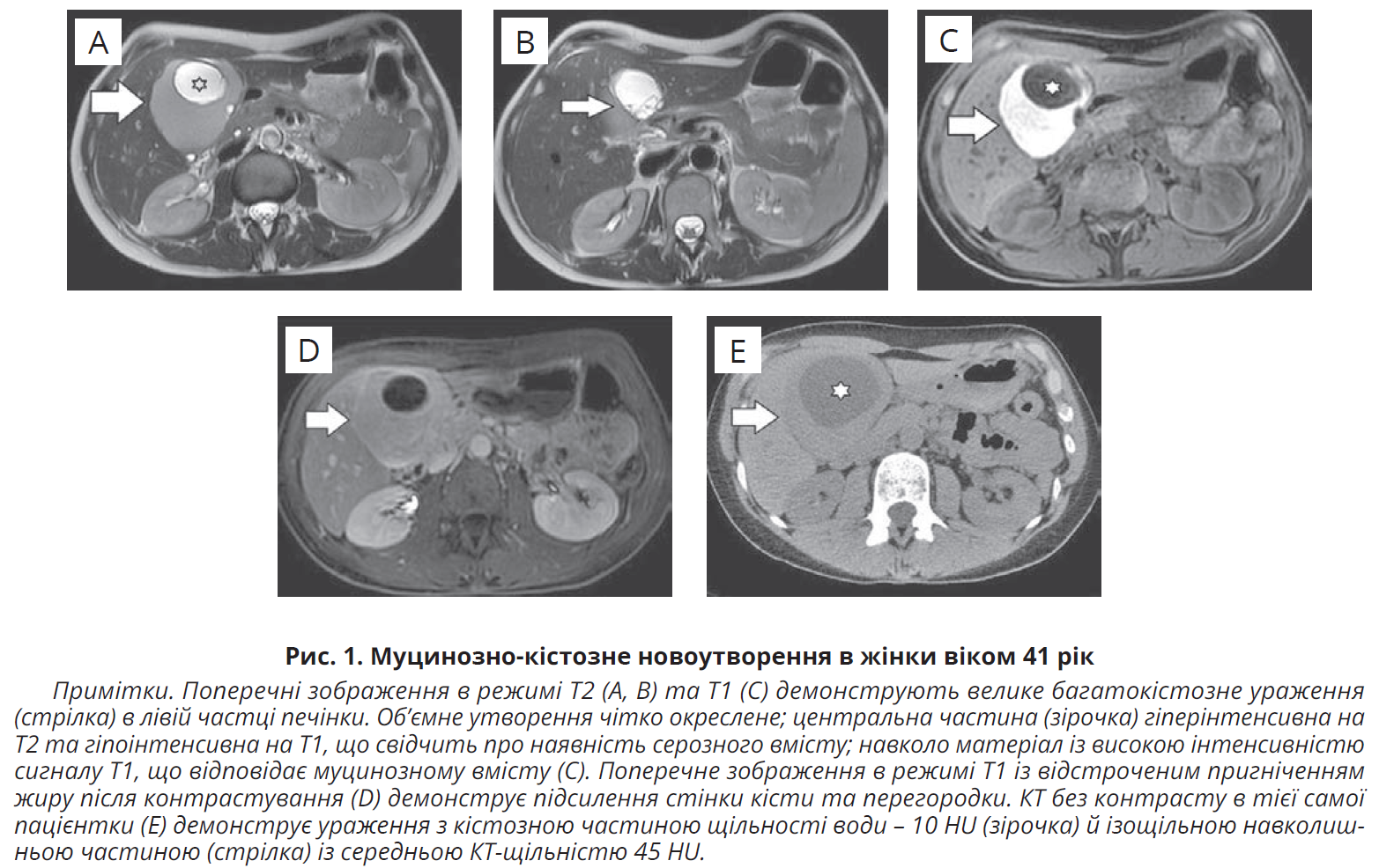 форми та підсиленням стінки кісти й перегородок після введення гадолінію. Такі ознаки, як тонкі перегородки, внутрішній крововилив, білково-казеозний детрит, рівні рідина-рідина, зв’язок із жовчними шляхами та проксимальним розширенням жовчних шляхів, краще видно на МРТ (рис. 1).