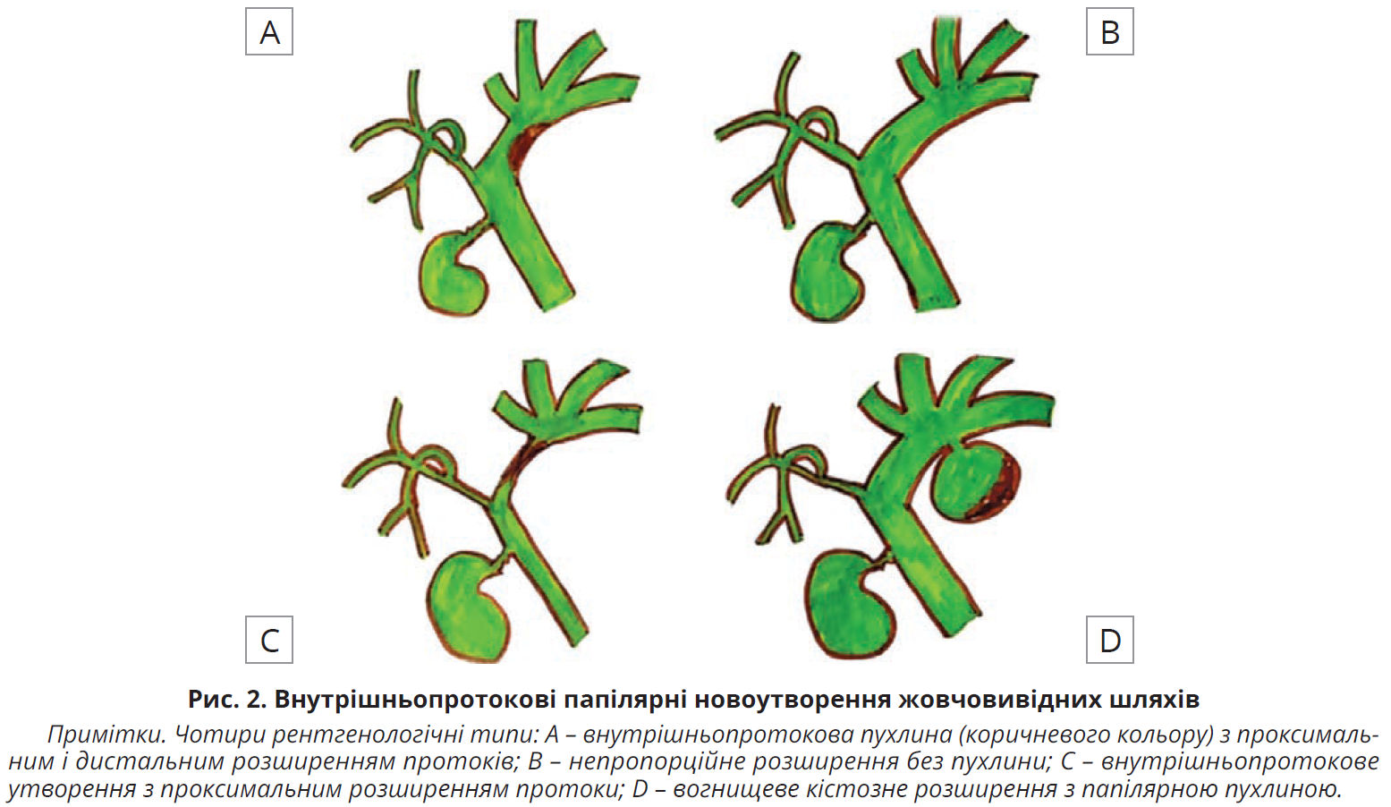 Існує чотири чіткі рентгенологічні моделі ВПНЖШ залежно від розміру та морфології внутрішньопротокової пухлини, ступеня секреції муцину й розташування пухлини (рис. 2).