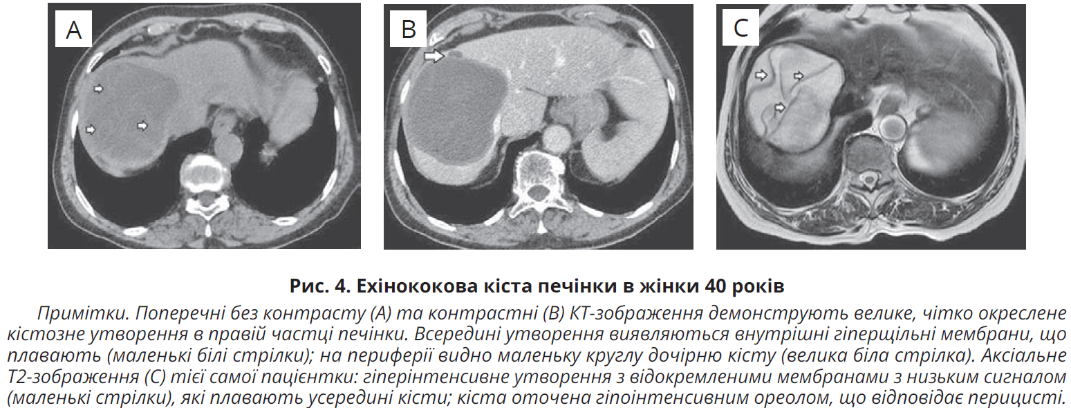 Методи КТ і МРТ допомагають у діагностиці піддіафрагмальних і позаабдомінальних кіст. КТ дає змогу виявити розташування та глибину кісти в паренхімі печінки, наявність кальцинованих стінок (у 50% випадків) і дочірніх кіст (у 75% пацієнтів), що полегшує рішення щодо хірургічного втручання. КТ-ознаки EК 1-го типу: чітко окреслені однолокулярні кістозні ураження без посилення (щільність води), що імітують ПКП. EК 2-го типу поділяються на підтип ІІА – кістозні ураження з круглими дочірніми кістами, розташованими на периферії, зазвичай меншої інтенсивності, ніж материнська кіста; підтип IIB – більші дочірні кісти неправильної форми, які займають майже всю материнську кісту, залишаючи між собою гіперщільну рідину, що створює вигляд «розетки»; підтип IIIC – гіперщільне, кругле або овальне внутрішньопечінкове утворення з розсіяними кальцифікатами й окремими дочірніми кістами (рис. 4A, B). Кальцифікація кісти видається гіперщільною на КТ, зазвичай криволінійна чи кільцеподібна, спочатку в перицисті, на пізніх стадіях хвороби – цілковита.