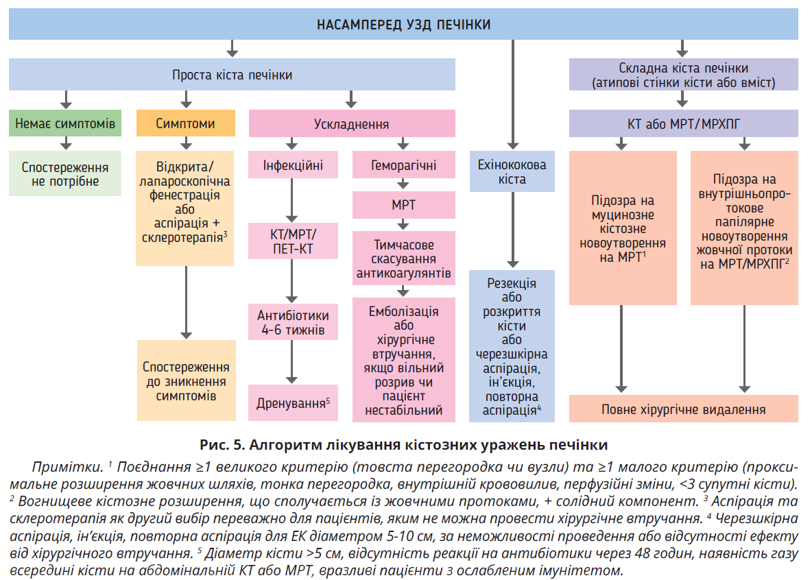 Кістозні ураження печінки поділяються на прості та складні; їх поширеність коливається від 2,5 до 18%. Більшість випадків припадає на прості кісти печінки (ПКП) – зазвичай безсимптомні доброякісні утворення стабільних розмірів, що рідко потребують лікування. Складні кістозні ураження печінки включають уроджені, передракові, неопластичні, інфекційні та посттравматичні ураження. У поєднанні з клінічними й лабораторними даними ультразвукове дослідження (УЗД), комп’ютерна томографія (КТ), магнітно-резонансна томографія (МРТ) й УЗД з контрастуванням надають діагностичну інформацію та класифікують складні кістозні ураження печінки. Більшість складних кіст потребують хірургічного втручання, тому проблема точної діагностики в цих випадках особливо актуальна, адже за відсутності ефективного лікування потенційно збільшуються захворюваність і смертність. Отож оновлена інформація щодо діагностики, класифікації й ефективного лікування найпоширеніших складних кістозних уражень печінки є актуальною.