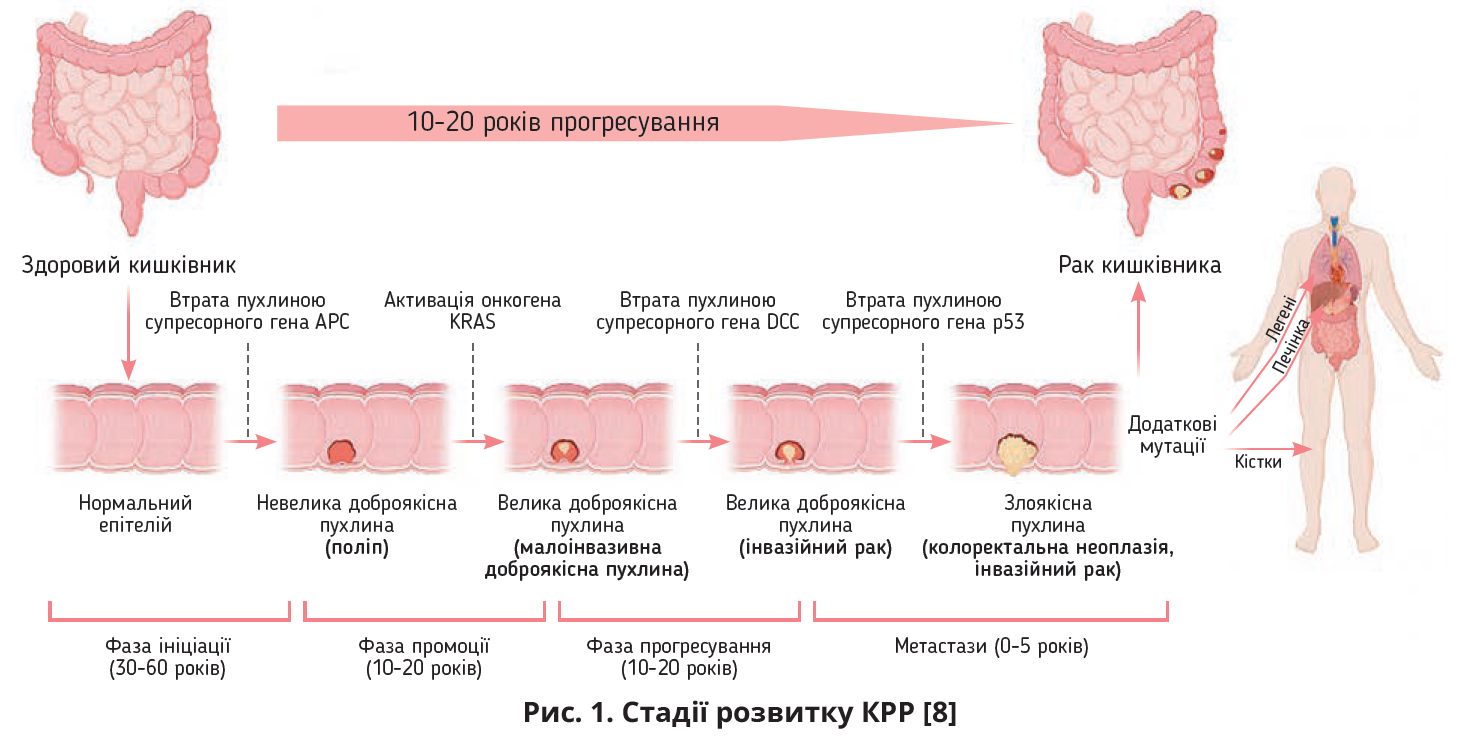 КРР, спричинений аберантною проліферацією клітин залозистого епітелію товстої кишки, є генетично різноманітним і розвивається, коли епітеліальні клітини набувають низки генетичних/епігенетичних змін, які роблять їх гіперпроліферативними [8]. Ці клітини, що швидко ростуть, утворюють доброякісну аденому, яка може трансформуватися в злоякісну пухлину та метастазувати кількома різними шляхами, включаючи мікросателітну нестабільність, хромосомну нестабільність і зубчасту неоплазію [8]. Через таку закономірність часто використовують вислів «аденома-карцинома», який підкреслює обов’язкове прогресування КРР. Неопластичний процес починається з крихітної аденоми, яка перетворюється на гігантську аденому та, зрештою, злоякісну пухлину, але ця трансформація займає декілька років (рис. 1).