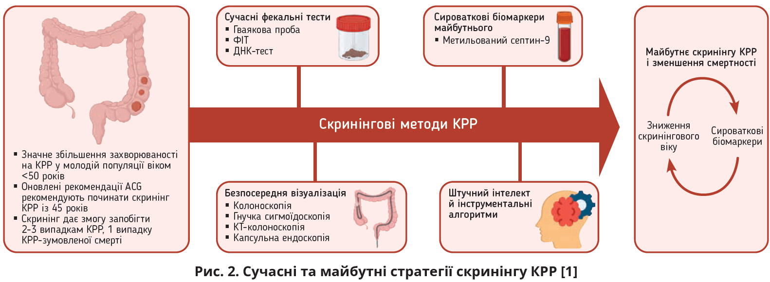 Скринінг КРР проводять із метою виявлення преканцерозних змін у безсимптомних осіб, що дає змогу діагностувати новоутворення на ранніх стадіях та істотно знизити смертність від КРР. Останніми роками декілька провідних міжнародних товариств представили оновлені настанови зі скринінгу КРР, у тому числі Американське онкологічне товариство (ACS) [17], Американська колегія гастроентерологів (ACG) [2], Американська гастроентерологічна асоціація (AGA) [9], об’єднана група ACG, AGA й Американського товариства гастроінтестинальних ендоскопістів (USPSTF) [6], Національне французьке гастроінтестинальне товариство [10], Австрійський національний комітет зі скринінгу раку [5]. Положення зазначених настанов відрізняються віковим порогом початку/завершення скринінгу та рекомендованим переліком досліджень.