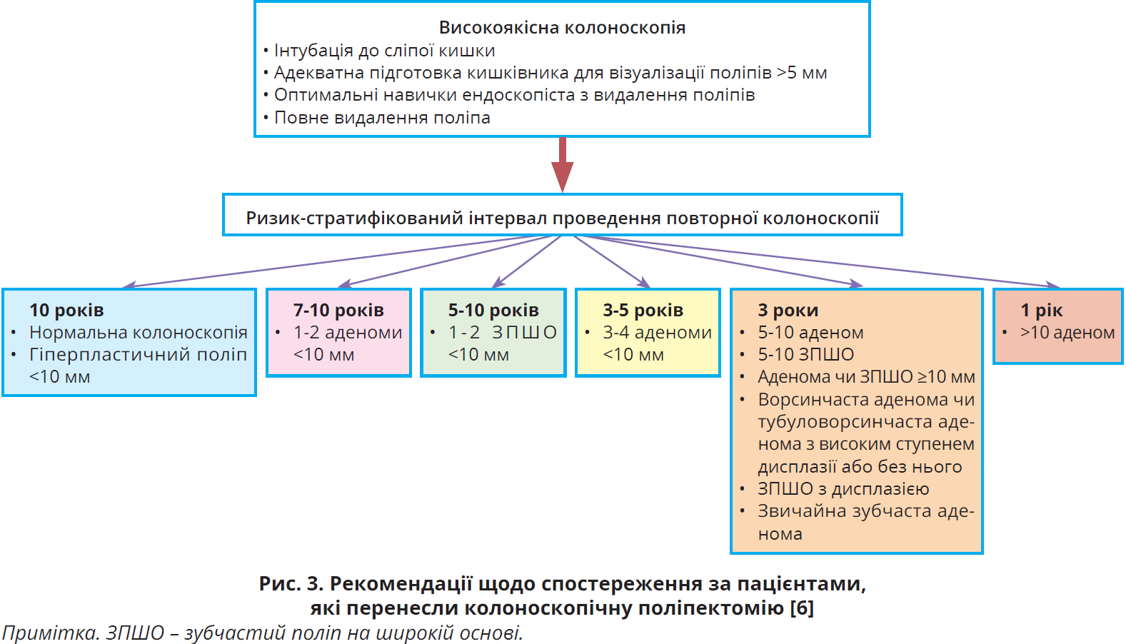 Окреме положення в скринінгу КРР займає спостереження за хворими, які перенесли колоноскопію з поліпектомією. Згідно зі спеціалізованими рекомендаціями USPSTF частота проведення КРР із виконанням повторної колоноскопії залежить від кількості, розміру та гістологічних характеристик аденом, які були виявлені під час вихідної колоноскопії (рис. 3) [6].