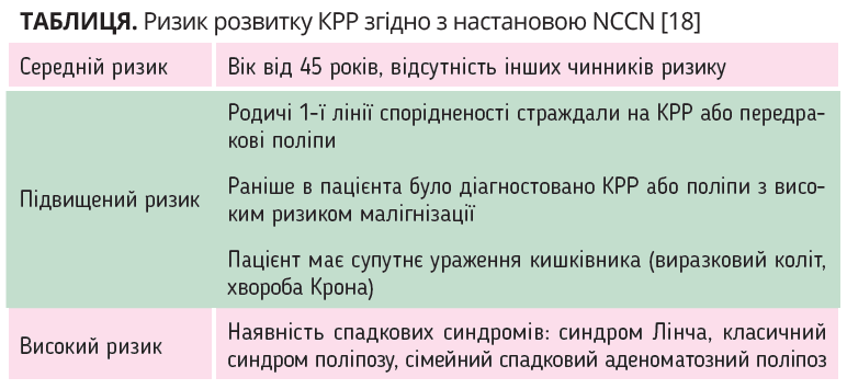 Національна загальна онкологічна мережа США (NCCN) розрізняє три рівні ризику КРР із метою виявлення пацієнтів із найвищою ймовірністю кишкових неоплазій (табл.).