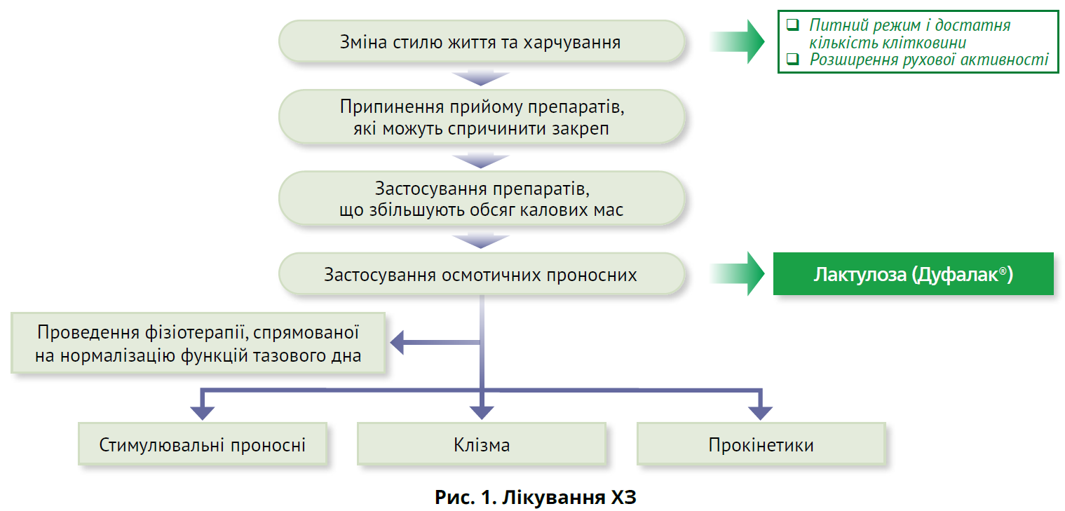 Терапія має бути індивідуальною, враховувати попереднє лікування та реальну можливість того, що ХЗ може мати багатофакторне походження. Вибір терапевтичного засобу для лікування симптомів закрепу має бути спільним рішенням пацієнта та лікаря, що враховує вартість, переносимість, безпеку, переваги для пацієнта, міркування про спосіб життя й іншу відповідну клінічну інформацію (рис. 1).