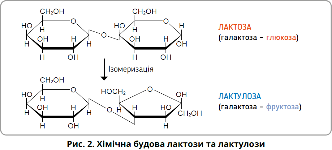 Лактулоза (4-O-β-D-галактопіранозил-D-фрукто-тофураноза) є неперетравлюваним, неабсорбованим, напівсинтетичним дисахаридом, що містить фруктозу та галактозу. Лактулоза не трапляється в природі, але утворюється з лактози при нагріванні молока в процесі хімічної ізомеризації (рис. 2).