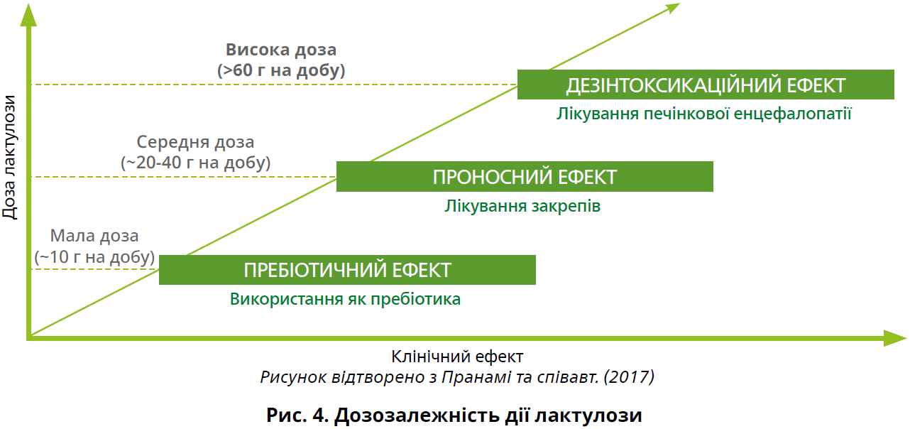 Дуфалак® має дозозалежний ефект: залежно від застосованої дози лактулоза може діяти як пребіотик, проносний або дезінтоксикаційний засіб (рис. 4) [1]. Кожен із цих ефектів виникає завдяки таким діям лактулози на кишківник, як зміна кишкової мікрофлори й утворення сприятливих метаболітів [2]. Отже, добова доза лактулози варіює залежно від типу та тяжкості стану, за якого вона використовуватиметься [1]. Наприклад, доза, потрібна для лікування печінкової енцефалопатії, набагато вища, ніж для лікування закрепів.