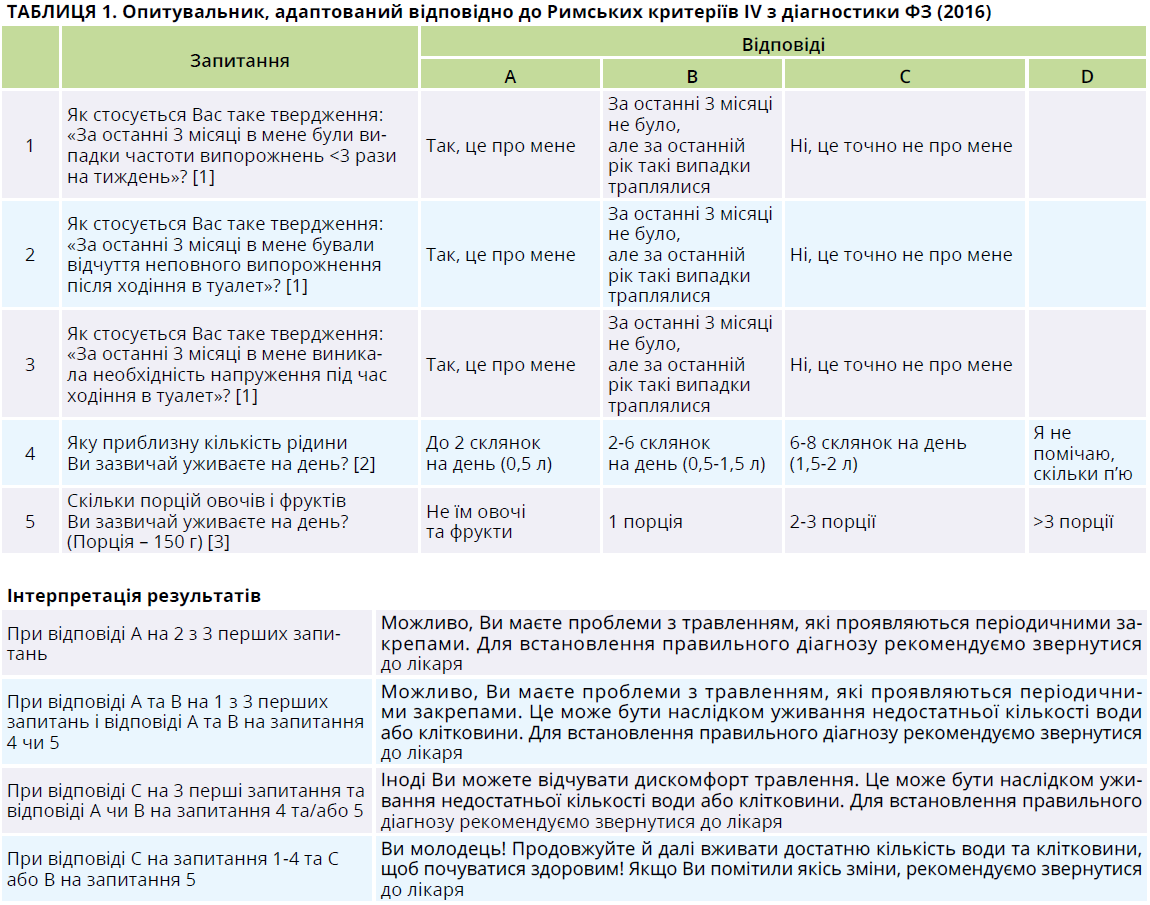 Низьке виявляння закрепу серед населення потребує пошуку шляхів підвищення обізнаності щодо цієї проблеми. Поточна поведінка пацієнтів із закрепом свідчить, що вони дуже рідко звертаються до лікарів саме з проблемою закрепів, не завжди інформують свого лікаря про наявність у них цього стану. Тому для первинної самодіагностики закрепу та розуміння необхідності звернення до лікаря може бути запропоновано короткий опитувальник щодо способу життя пацієнта (табл. 1).