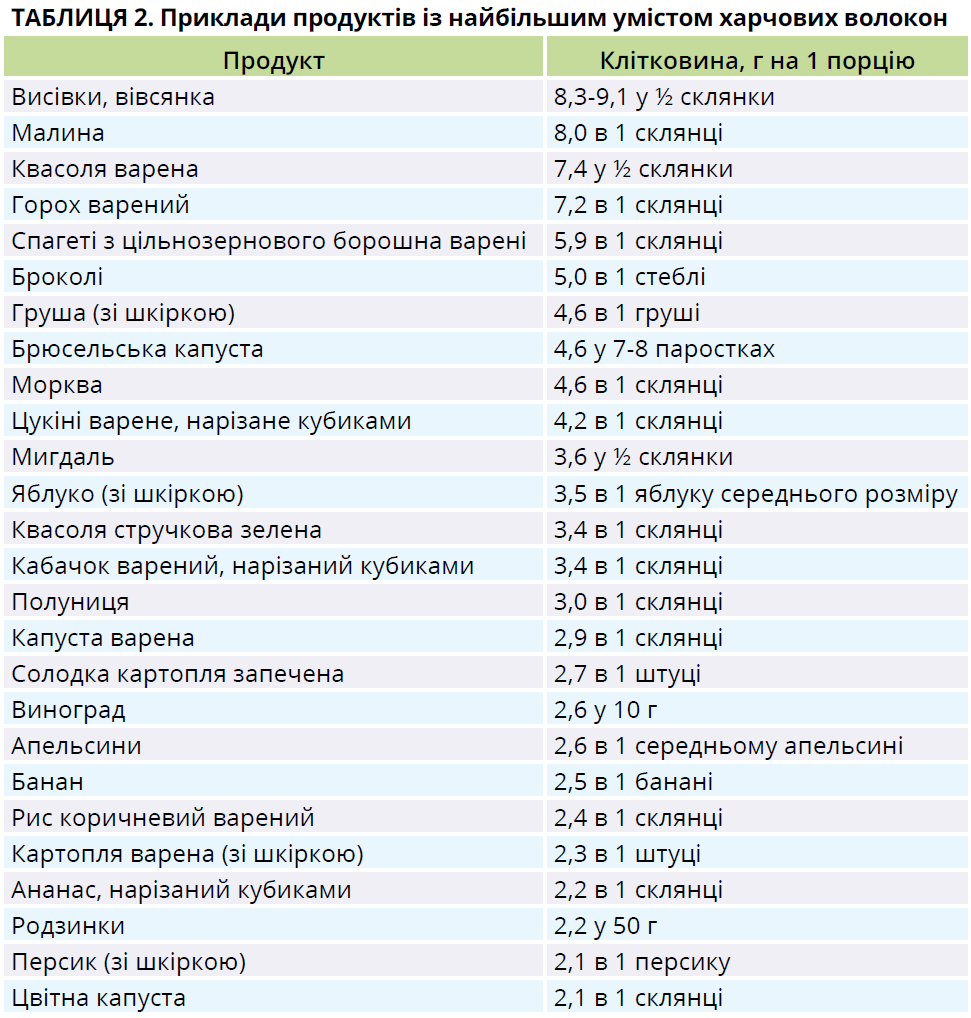 Продукти розподіляють на багаті на клітковину, що містять ≥3 г клітковини на порцію продукту, та з високим умістом клітковини, що містять ≥5 г клітковини на порцію продукту (табл. 2).