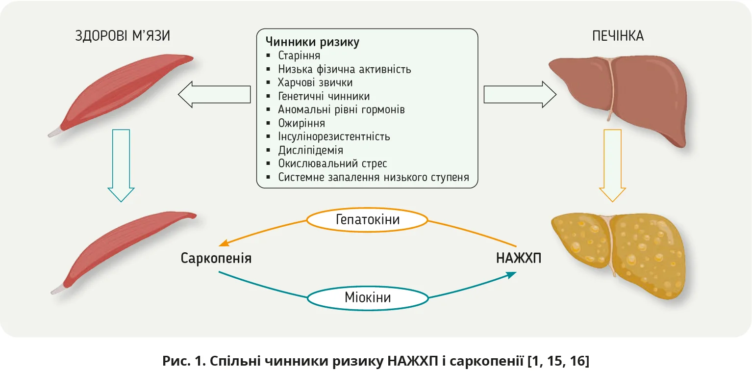 Пацієнтам з НАЖХП притаманний високий рівень втрати м’язової маси та сили [14]. Дедалі більше досліджень підтверджують наявність зв’язку між саркопенією та НАЖХП, які поділяють низку чинників ризику (рис. 1) [15, 16].