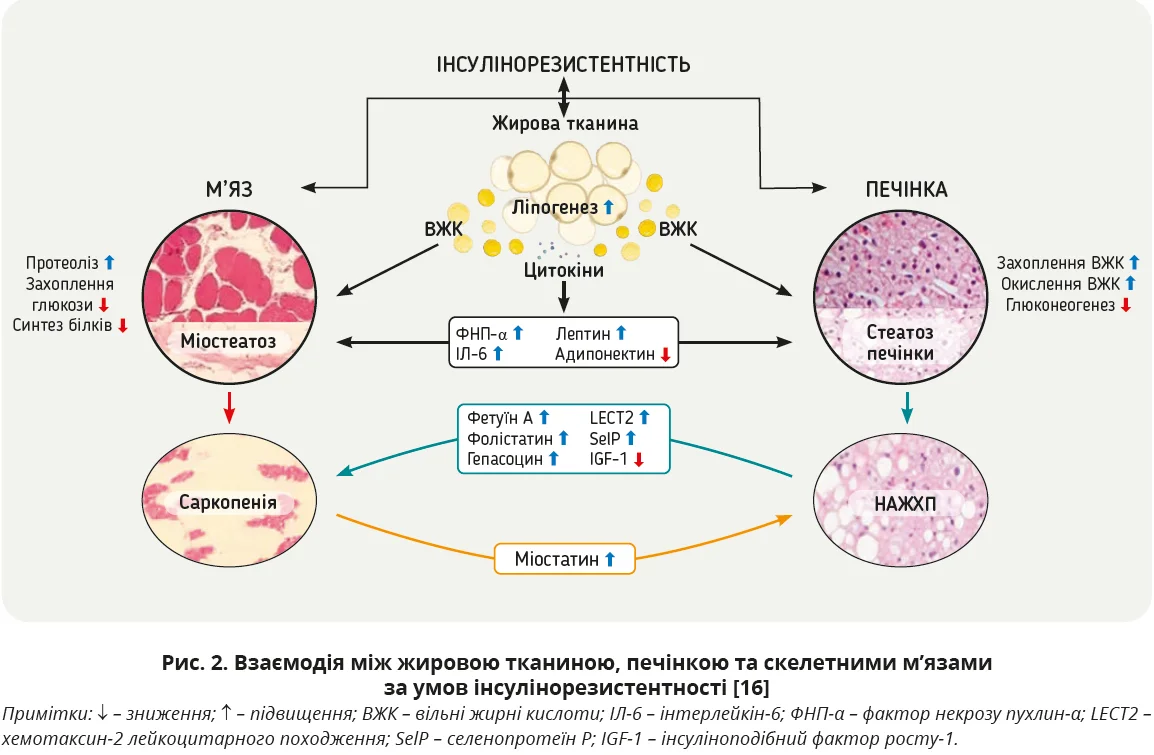 Порушення передачі сигналів інсуліну внаслідок впливу запальних цитокінів за ожиріння підвищує рівень вільних жирних кислот у плазмі крові, що призводить до накопичення ліпідів у печінці та м’язах. Інсулінорезистентність опосередковано впливає на метаболізм глюкози й ліпідів у печінці шляхом збільшення субстратів (глюкоза, жирні кислоти, гліцерин), які спричиняють ліпогенез і глюконеогенез [16]. Як відомо, інсулін підтримує м’язову масу через активацію мішені рапаміцину ссавців (mTOR) і відіграє важливу роль в анаболізмі скелетних м’язів. Отже, інсулінорезистентність у скелетних м’язах призводить до посиленої деградації м’язів, зниження вмісту мітохондрій і порушення окислювальної здатності в міоцитах [20]. Певну роль у прогресуванні саркопенії можуть відігравати цитокіни, що посилено вивільняються за НАЖХП. Окрім того, клітини печінки виділяють гепатокіни – білки, що виділяються автокринними, паракринними й ендокринними шляхами, зокрема фетуїн А, фолістатин, гепасоцин, хемотаксин-2 лейкоцитарного походження (LECT2), селенопротеїн P (рис. 2). Підвищення фетуїну А зумовлює печінковий глюконеогенез і синтез ліпідів, посилюючи інсулінорезистентність і запалення та спричиняючи саркопенію. Підвищення рівня LECT2 опосередковує ожиріння й інсулінорезистентність у скелетних м’язах. Експансія та ремоделювання білої жирової тканини в умовах ожиріння призводить до утворення депо вісцерального жиру, що спричиняє або посилює ліпотоксичність, запалення й порушує нейроендокринну функцію. Ліпотоксичність зумовлює проникнення макрофагів та інших імунних клітин у жирову тканину, що призводить до вивільнення фактора некрозу пухлин-α, інтерлейкіну-6 й інших запальних цитокінів; це спричиняє хронічне системне запалення низького ступеня. Запальні медіатори знижують реакцію м’язів на інсулін та інсуліноподібний фактор росту-1 (IGF-1), що призводить до стресу ендоплазматичного ретикулуму, мітохондріальної дисфункції та деградації м’язів [16, 21].