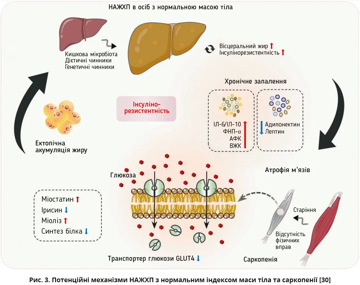 Потенційні механізми взаємозв’язку між НАЖХП з нормальним ІМТ та саркопенією насамперед зумовлені інсулінорезистентністю й ектопічним відкладанням жиру. Надмірне споживання їжі та знижене споживання енергії, а також генетична схильність й інші чинники призводять до накопичення вісцерального жиру, інсулінорезистентності та виникнення НАЖХП за відсутності надмірної маси тіла. Одночасно інсулінорезистентність і метаболічні запальні процеси погіршують життєве середовище м’язових клітин, посилюють атрофію м’язів і призводять до виникнення саркопенії. Втрата маси скелетних м’язів пригнічує вісь «гормон росту – IGF-1», що призводить до зниження синтезу м’язового білка та посилення ліполізу. Зменшення експресії інсулінозалежного транспортера глюкози GLUT4 при саркопенії ще більше пригнічує утилізацію глюкози та посилює інсулінорезистентність, замикаючи згубне коло (рис. 3) [30].