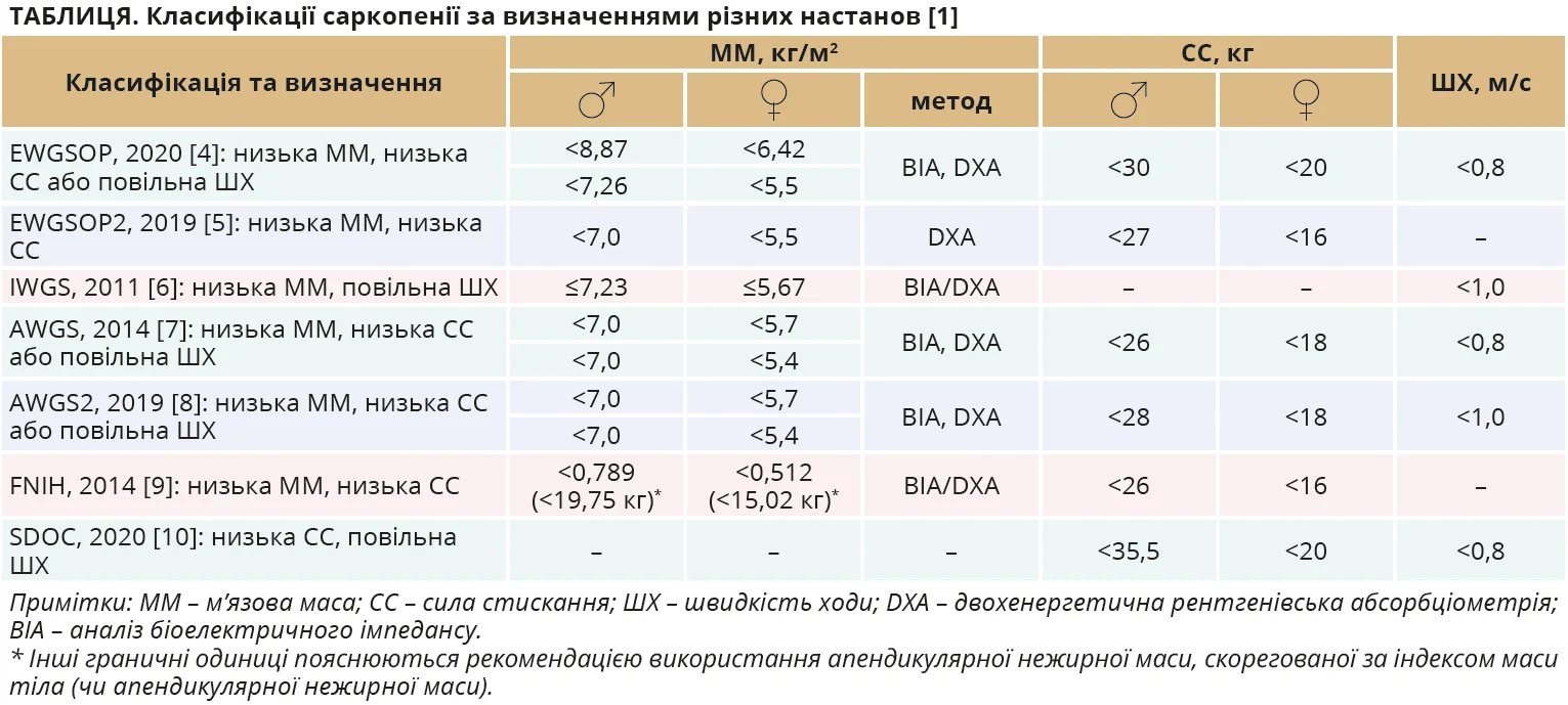 Хоча саркопенія частіше вражає людей похилого віку, її початок можливий у молодших вікових групах за наявності інших розладів, як-от резистентність до інсуліну, ожиріння, цукровий діабет 2-го типу, остеопороз. Існує багато чинників ризику саркопенії, зокрема вік, стать, недоїдання, недостатня фізична активність, хронічні хвороби та використання певних ліків [11, 12]. Через неоднорідність діагностичних критеріїв, різноманітність методів вимірювання м’язової маси та різні порогові значення (табл.) оцінки поширеності саркопенії суттєво коливаються: 5-13% у віці 60-70 років, 11-50% у віці понад 80 років [13]. Початок і прогресування саркопенії зазвичай непомітні, але цей стан погіршує якість і тривалість життя, а також підвищує ризик низки захворювань, зокрема опорно-рухового апарату, збільшуючи потребу в госпіталізації. Крім того, діагностика саркопенії передбачає комплексне оцінювання м’язової маси та сили із застосуванням сучасних методів візуалізації, використання котрих обмежене в рутинній клінічній практиці [1]. Отже, поширеність саркопенії часто недооцінюється.