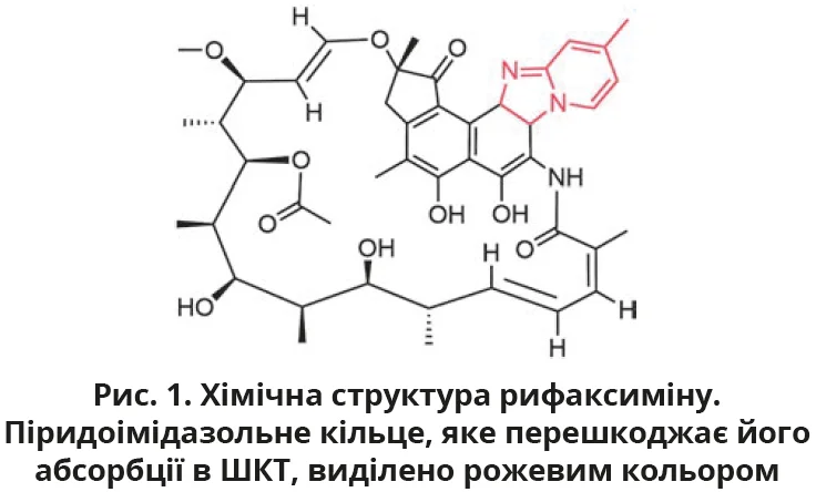 Рифаксимін є похідним рифаміцину з покращеними фармакокінетичними та фармакодинамічними властивостями. Завдяки піридоімідазольному кільцю він практично не абсорбується в шлунково-кишковому тракті (ШКТ), але є розчинним у жовчних солях, має широкий спектр протимікробної активності поряд з високим профілем безпеки (рис. 1). Спочатку рифаксимін було представлено для лікування інфекційної діареї, потім – діареї мандрівників, а тепер застосовується в терапії інфекційних захворювань ШКТ.