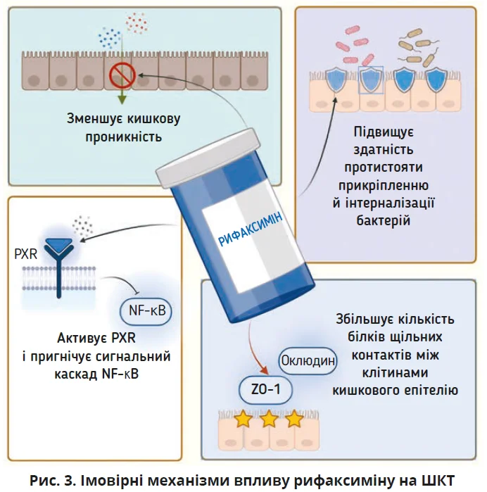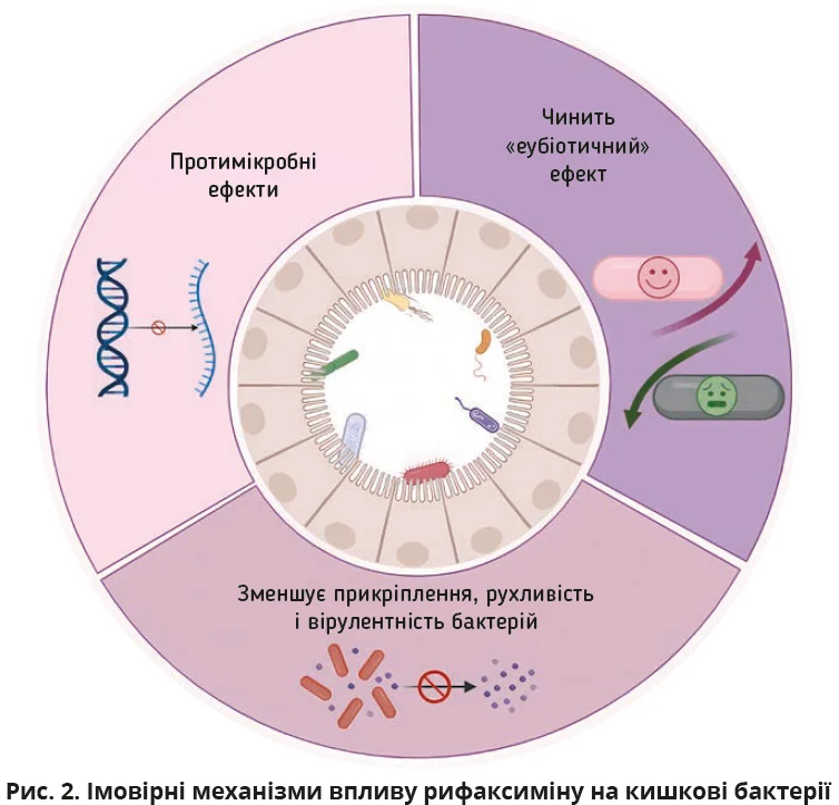 Кілька досліджень показали, що модифікація КМ рифаксиміном може зумовлювати зміни у складі жовчних кислот і модулювати функцію мікробіому. Рифаксимін збільшує кількість корисних бактерій, як-от Lactobacillus і Faecalibacterium prausnitzii, та має корисний «еубіотичний» ефект. Порушення нормального КМ збільшує проникність кишківника, а знижений рівень жовчних кислот посилює транслокацію кишкових бактерій шляхом зменшення кількості білків щільного з’єднання між клітинами кишкового епітелію, як-от оклюдин і zonula occludens-1 (ZO-1). Найважливіші біологічні ефекти рифаксиміну пов’язані з пригніченням прикріплення й інтерналізації бактерій, а також зниженням рухливості бактерій і гена вірулентності. Механізми дії рифаксиміну на кишкові бактерії узагальнено на рисунку 2.
