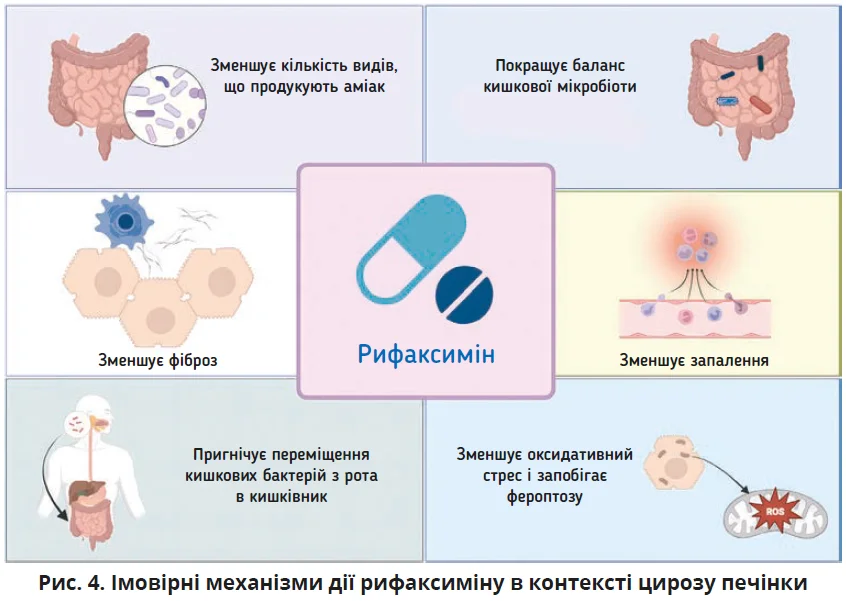 Печінка має тісний зв’язок з кишківником шляхом вивільнення жовчних кислот і транспортування імунореактивних і поживних речовин у системний кровообіг, що визначається як вісь кишківник – печінка. КМ має першочергове значення в патогенезі цирозу, а порушення регуляції кишкової мікробної активності пов’язане з декомпенсацією цирозу. Дисбаланс між здоровими та патогенними кишковими бактеріями на користь прозапальних і видів, що продукують аміак, як-от Enterobacteriaceae, Firmicutes, Archaea та Prevotella, призводить до підвищеного рівня ендотоксинів у плазмі. Кишковий ендотоксин є вирішальним фактором системного запалення та фіброгенезу при захворюваннях печінки й пов’язаний з тяжкістю цирозу. На моделях щурів показано, що антибіотики захищають від алкоголь-асоційованих захворювань печінки та знижують смертність тварин шляхом зменшення вироблення кишкового ендотоксину. З огляду на чинники резистентності й пов’язані з використанням антибіотиків побічні ефекти припускають, що рифаксимін може безпечно уповільнити прогресування цирозу та запобігти ускладненням, пов’язаним із традиційними препаратами. Імовірні механізми дії рифаксиміну в контексті цирозу печінки узагальнено на рисунку 4.