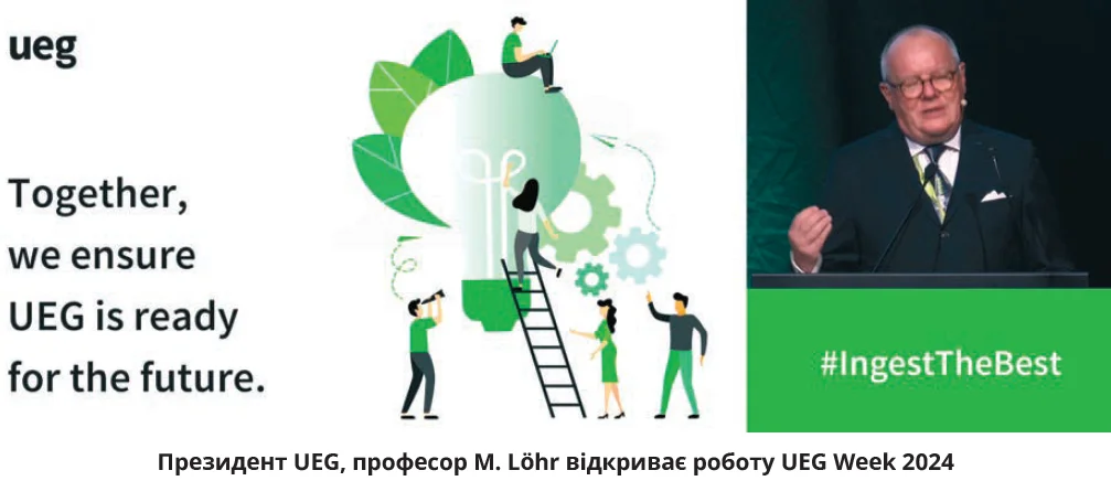 За традицією відкрив наукову роботу конгресу президент UEG, професор Matthias Löhr. У своєму короткому привітальному виступі він назвав Гастротиждень-2024 рекордним за кількістю офлайн- та онлайн-учасників, прийнятих анотацій і зареєстрованих заявок на проходження курсів післядипломної освіти, а також семінарів, які транслювалися онлайн. Наукова програма конгресу була надзвичайно насичена: протягом 5 діб пролунала велика кількість усних доповідей, проведено 178 семінарів. Уперше за всю історію UEG Week роботу конгресу підтримував штучний інтелект, за допомогою якого забезпечували переклад будь-якого семінару та сесії на 11 найпоширеніших мов. Професор M. Löhr рекомендував делегатам використовувати у своїй практичній діяльності безплатні мобільні застосунки, які розроблені під егідою UEG. В одному з них, GI Guidelines App, містяться тексти настанов з діагностики та лікування гастроентерологічної патології. Крім текстових варіантів, у цьому застосунку наведено практичні алгоритми та покрокові схеми дії лікарів. Президент конгресу закликав делегатів приєднатися до MyUEG Community – ексклюзивної та безпечної мережевої платформи, створеної для пошуку й налагодження зв’язків з міжнародними фахівцями в галузі гастроентерології. Завдяки цій платформі можна розширити свої професійні зв’язки з міжнародними колегами й однодумцями.