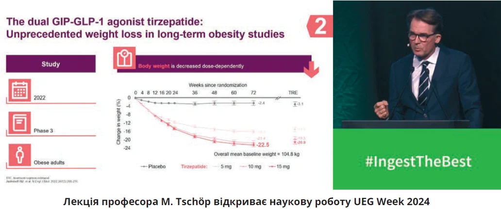 Почесне право розпочати наукову роботу UEG Week 2024, прочитавши вступну лекцію, отримав професор Matthias Tschöp (Німеччина). Тема, яку обрав доповідач, – «Коагоністи кишкових гормонів для лікування метаболічного синдрому: від лабораторного столу до ліжка хворого» – зацікавила багатьох делегатів. Згідно із сучасними поглядами на патофізіологію метаболічного синдрому наріжним каменем подолання цієї патології є модифікація дії гормону глюкагону. Останньому притаманний широкий спектр позитивних властивостей (активація ліполізу й окислення жирних кислот, стимуляція термогенезу та синтезу жовчних кислот, інгібування споживання їжі) на тлі декількох небажаних ефектів, з погляду патофізіологів, у вигляді активації синтезу глюкози та збільшення рівня глікемії. Команда науковців під керівництвом М. Tschöp досліджувала терапевтичний потенціал подвійних агоністів рецепторів глюкозозалежного інсулінотропного поліпептиду (ГІП) і глюкагоноподібного пептиду-1 (ГПП-1) у лікуванні метаболічного синдрому й ожиріння. Професор прокоментував перші клінічні результати використання тирзепатиду, першого подвійного агоніста рецепторів ГІП/ГПП-1, офіційно схваленого Управлінням США з контролю продовольства й медикаментів (FDA) та Європейською агенцією з лікарських засобів (ЕМА) для лікування ожиріння, надлишкової маси тіла, який також використовується у хворих на цукровий діабет завдяки його здатності нормалізувати рівень глікемії.