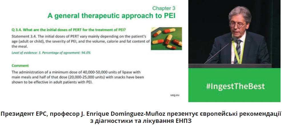 Однією з родзинок UEG Week 2024 стала презентація «Європейських міждисциплінарних рекомендацій з діагностики та лікування екзокринної недостатності підшлункової залози (ЕНПЗ): рекомендації UEG, EPC, EDS, ESPEN, ESPGHAN, ESDO й ESPCG». Почесне право представити настанову від імені поважних авторитетних товариств отримав президент Європейського панкреатичного клубу (EPC), професор J. Enrique Domínguez-Muñoz. Представляючи оновлені погляди на патогенез, клінічну значущість, діагностику, лікування та моніторинг ЕНПЗ, доповідач підкреслив необхідність систематичного повторного оцінювання низки показників. Призначаючи лікування ЕНПЗ, доцільно обирати препарати панкреатичних ферментів, зокрема панкреатин, тому що вони визнані засобами терапії 1-ї лінії. Найоптимальнішими вважають препарати, які містять часточки невеликого розміру, вкриті кишковорозчинною оболонкою. Початкові дози замісної ферментної терапії значно залежать від віку пацієнта (дорослий чи дитина), ступеня тяжкості ЕНПЗ та вмісту жирів у їжі. Професор наголосив, що найефективнішим у дорослих визнано застосування панкреатиновмісних препаратів у дозі 40 000-50 000 ОД ліпази під час основних прийомів їжі та половини цієї дози (20 000-25 000 ОД) під час перекусів.
