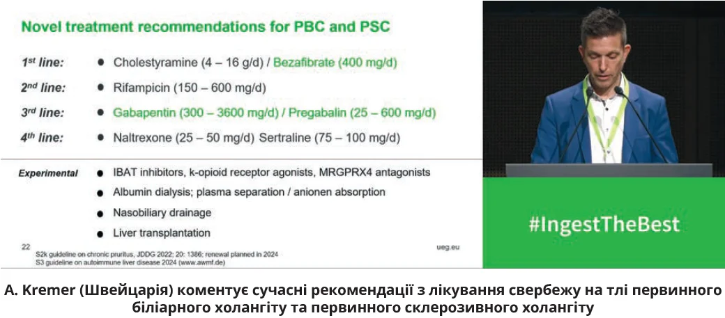 Значною частиною UEG Week 2024 стало післядипломне навчання: в межах цієї ініціативи проведено 26 наукових сесій, протягом яких пролунала 121 доповідь. Серед терапевтичних сесій особливо виділялося засідання «Як лікувати свербіж?». У цій сесії взяли участь п’ять експертів, які обговорювали проблему свербежу в гепатологічній практиці з різних боків. Robert Jänsch (Німеччина) представив клінічний випадок ведення амбулаторного гепатологічного хворого зі свербежем. Докладну характеристику різноманітної клінічної симптоматики та поширеності свербежу навела професорка Verena Keitel-Anselmino (Німеччина), тоді як наступна лекція Ronald Oude Elferink (Нідерланди) пояснила патофізіологію виникнення цього патологічного симптому. Історичну довідку зі становлення фармакотерапії свербежу озвучив Ansgar Deibel (Швейцарія), а професор Andreas Kremer (Швейцарія) охарактеризував сучасні стратегії його лікування. Доповідач підкреслив важливість короткого підстригання нігтів і використання бавовняної постільної та нижньої білизни, підтримання прохолодного температурного режиму в кімнаті, призначення світлотерапії. Згідно з більш ранніми рекомендаціями фармакотерапією свербежу 1-ї лінії вважали холестирамін (4-16 г на добу), терапією 2-ї лінії був рифампіцин (150-600 мг на добу); налтрексон (25-50 мг на добу) й сертралін (75-100 мг на добу) займали, відповідно, третю та четверту сходинки в рекомендаціях. У межах клінічного дослідження FITCH (n=74) доведено здатність безафібрату (гіполіпідемічного засобу) знижувати інтенсивність свербежу на ≥50% у хворих на первинний біліарний холангіт, первинний склерозивний холангіт за умови використання препарату в добовій дозі 400 мг.