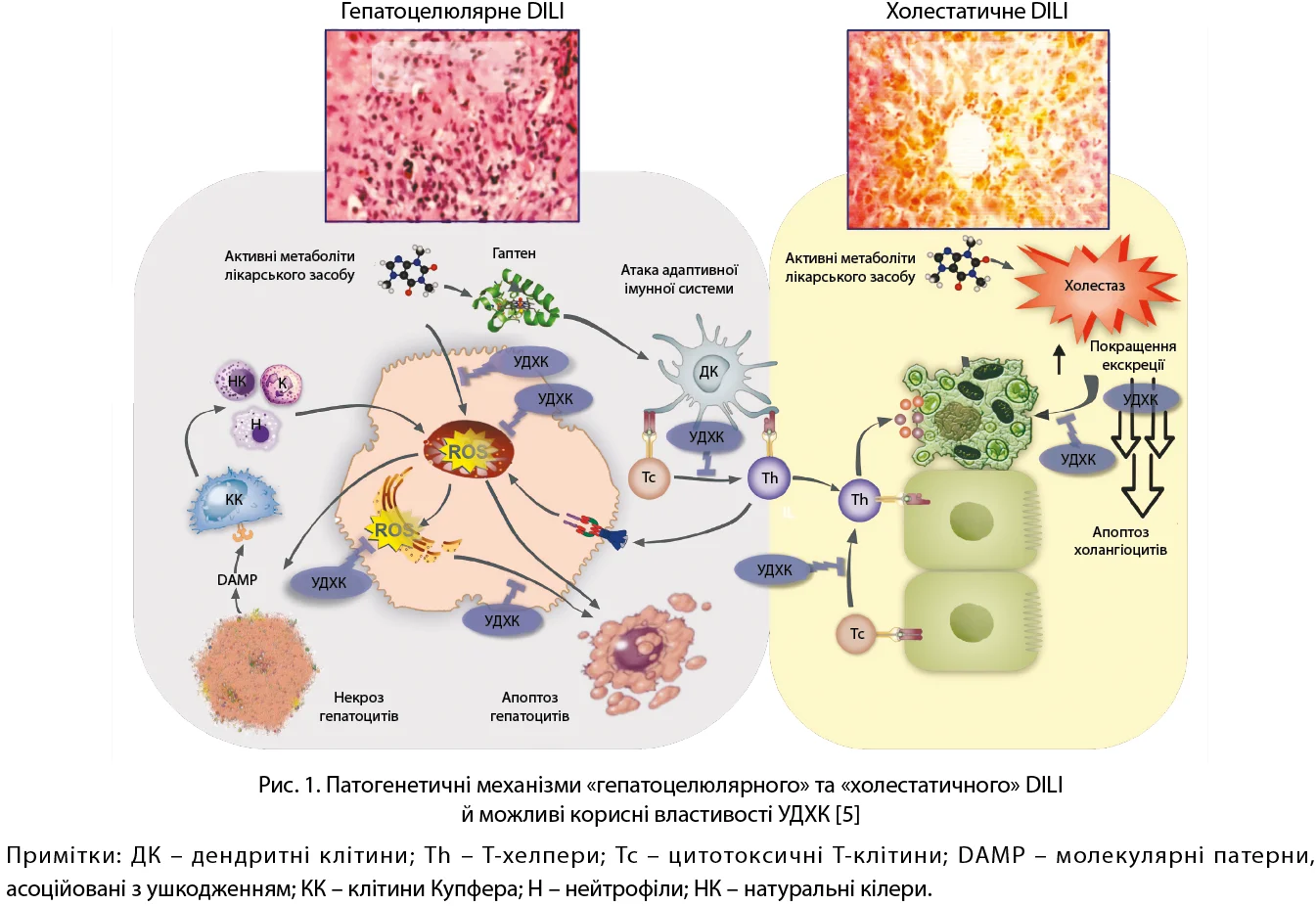 Лікарський засіб або його активні метаболіти здатні уразити гепатоцити декількома шляхами. Вони охоплюють пряме ушкодження або імуноопосередковані атаки як уродженої, так і адаптивної імунної системи. Пошкодження мітохондрій виникає внаслідок прямого хімічного впливу лікарського засобу або опосередкованого впливу активних форм кисню, яке спричиняє утворення мітохондріальних пор. Це запускає внутрішні (мітохондріальні) шляхи загибелі клітин, які призводять до апоптозу або некрозу, залежно від рівня виснаження АТФ. Реактивні метаболіти лікарських засобів можуть діяти як гаптени, запускаючи адаптивну імунну відповідь шляхом ковалентного зв’язування з білками. Ці гаптен-білкові комплекси презентуються дендритними клітинами наївним Th- і Tc-лімфоцитам в асоціації з молекулами MHC I або II класу відповідно. Активовані таким чином Тс-клітини вивільняють або експресують на своїй плазматичній мембрані цитокіни, що взаємодіють з рецепторами смерті на гепатоцитах, запускаючи шлях зовнішнього апоптозу. Реактивні метаболіти ліків або значний уміст активних форм кисню, які генеруються сусідніми мітохондріями, спричиняють стрес ЕР, який запускає додаткові проапоптичні сигнали, що посилюють апоптоз гепатоцитів. Втрата цілісності мембрани на тлі некрозу призводить до вивільнення DAMP з різних внутрішньоклітинних компартментів. Це запускає вроджену імуноопосередковану відповідь через TLR-опосередковану активацію Купферових клітин, що призводить до вивільнення цитокінів. Останні залучають і активують нейтрофіли, натуральні кілери, макрофаги, які спричиняють загибель гепатоцитів. УДХК втручається в ці патогенетичні механізми на багатьох рівнях завдяки своїм антиоксидантним, протизапальним, антиапоптотичним, антинекротичним, мітопротекторним, імуномодулювальним властивостям і здатності зменшувати стрес ЕР.