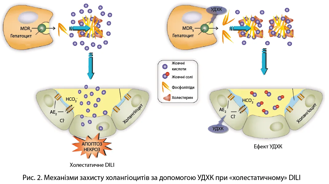 Нарешті, УДХК має унікальні властивості, які послаблюють ураження холангіоцитів, індуковане жовчними кислотами, при обструктивному DILI (рис. 1 і 2):