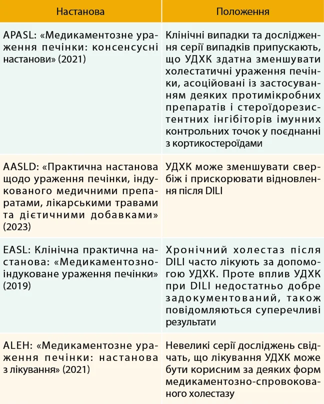 Таблиця. Положення деяких практичних настанов щодо застосування УДХК при DILI
