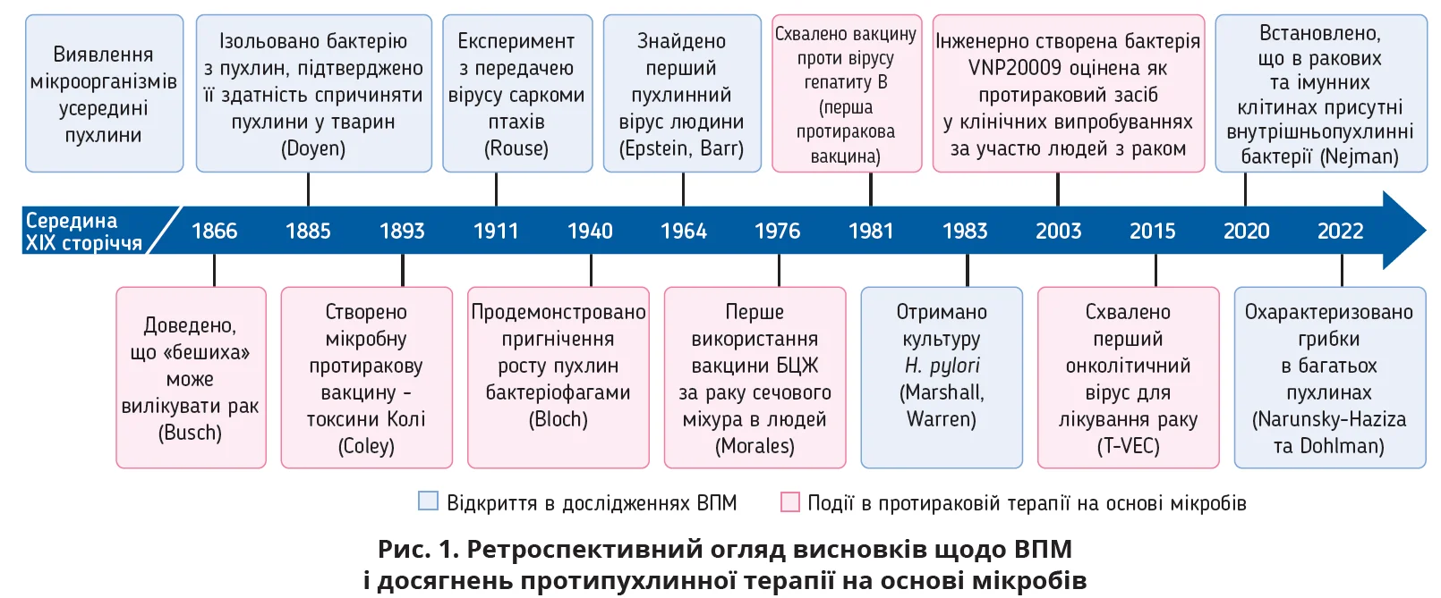 Мікробіота людини містить близько 38 трильйонів мікроорганізмів, що приблизно дорівнює кількості людських клітин. Завдяки інноваційним технологіям було встановлено, що тканини й органи, які колись вважалися стерильними (легені, молочна залоза, печінка, підшлункова залоза, простата, нирки), насправді містять мікробні спільноти. У зв’язку з виявленням мікроорганізмів у 33 основних типах злоякісних пухлин запропоновано концепцію внутрішньопухлинної мікробіоти (ВПМ), що є невід’ємною частиною мікрооточення пухлини. Мікроорганізми всередині пухлини здатні істотно змінювати біологію різних клітин, впливаючи на виникнення, розвиток і метастазування пухлин і протипухлинний імунітет. Основні повідомлення про важливі відкриття, пов’язані з ВПМ, ілюструє рисунок 1. Переклад огляду підсумовує характеристики й нові функції ВПМ у різних пухлинах травного тракту, вплив ВПМ на розвиток раку та протипухлинний імунітет і перспективи застосування ВПМ у прогнозуванні й терапії раку.
